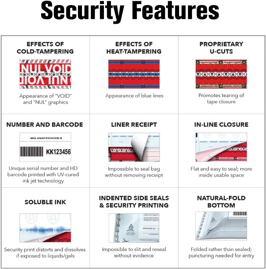 - TAMPER EVIDENT DEPOSIT BAGS: The tamper-evident security feature of the bags is so advanced that it's virtually impossible to hide tampering. They are made of co-extruded recyclable plastic that prevents puncturing or tearing.