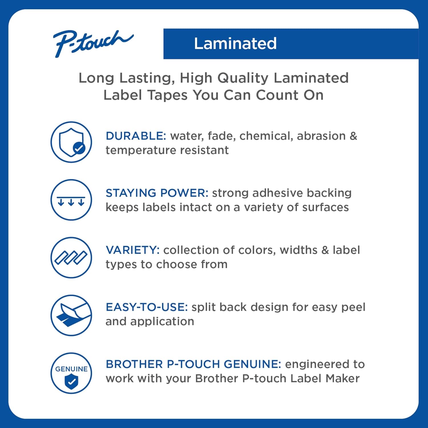 - STAYS STRONG: Brother adhesive label tape stays strong but can be removed without leaving any residue. These adhesive laminated tapes are also safe for photo-labeling and scrap-booking.