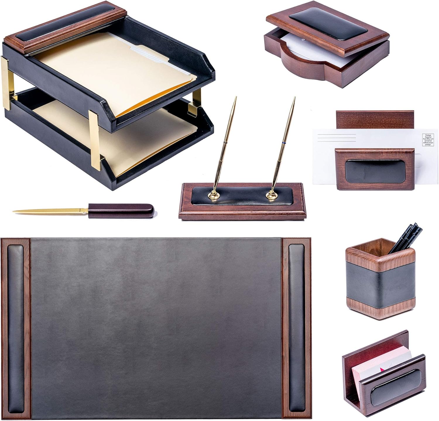 - LUXURY ADDITION TO THE OFFICE SETTINGS: All components of this set are made with Top-Grain Leather & walnut-stained African rosewood allowing you the elegance of a leather office desk set without breaking the bank. From the soft, supple surface to the fine stitching and precise edges, each handcrafted piece is created with the utmost care and attention to detail.