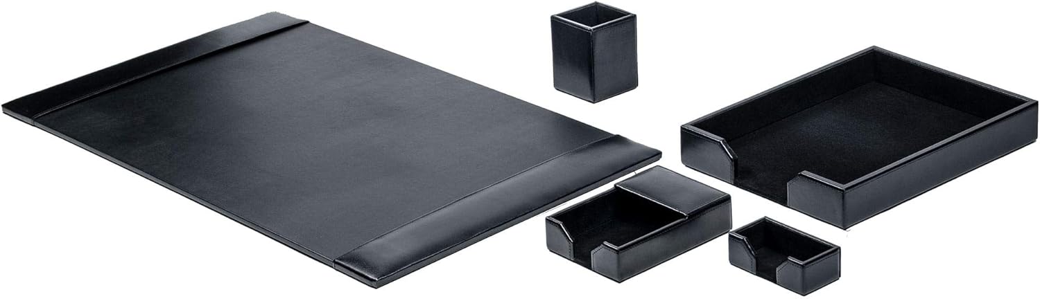 - CONTENTS: This leather desk organizer set includes a 30" x 18" side-rail desk pad, a front-load letter-size tray, a pencil cup, a 4" x 6" memo holder and a business card holder.