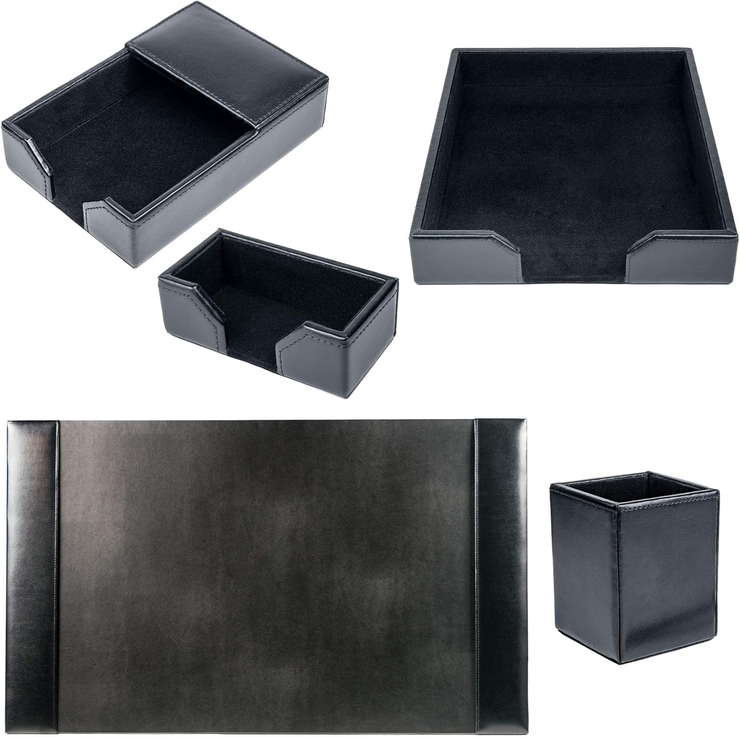 - LUXURY WITHOUT THE PRICETAG: All components of this set are made with beautiful bonded leather, allowing you the elegance of a leather office desk set without breaking the bank. From the soft, supple surface to the fine stitching and precise edges, each handcrafted piece is created with the utmost care and attention to detail.