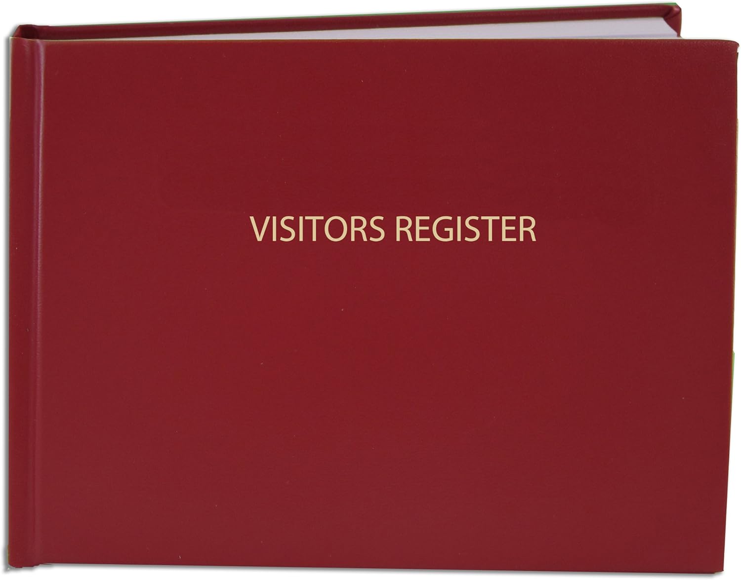 - Hardbound book with Red imitation leather cover and stamped with “VISITORS REGISTER” Reorder SKU: LOG-120-Visitor-A-LRT34