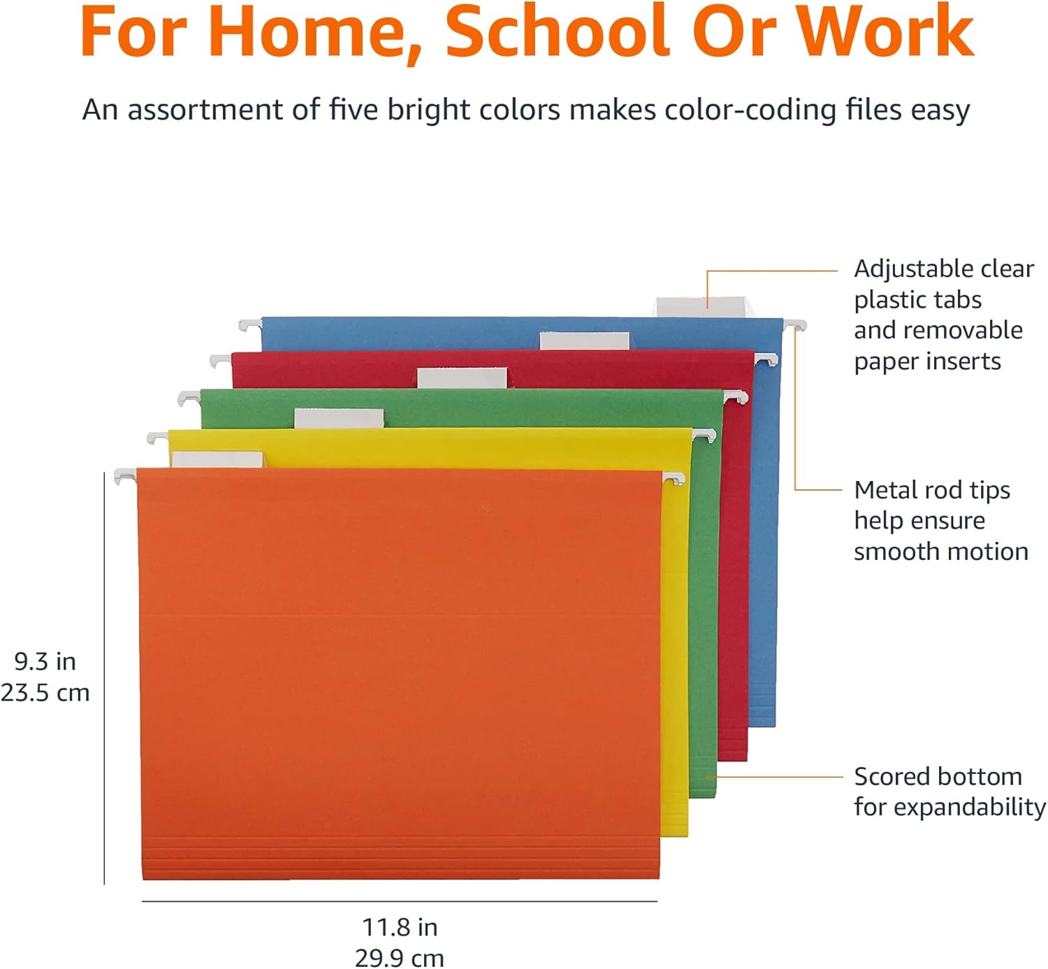 Amazon Basics Hanging Organizer File Folders for Efficient Filing, Assorted Colors, Letter Size (Pack of 25)