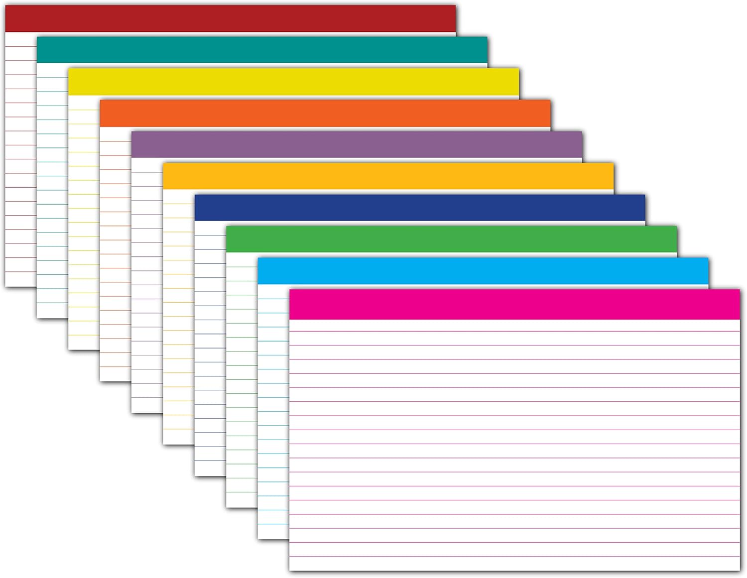 DEBRADALE DESIGNS - Color Bar Ruled Single Sided Index Cards - 5 x 8 Inches - White - 500 (50 each of 10 colors) - Wrapped in 2 packages of 250 - Standard 110# Index Card Stock - 199 GSM - .009 Thick
