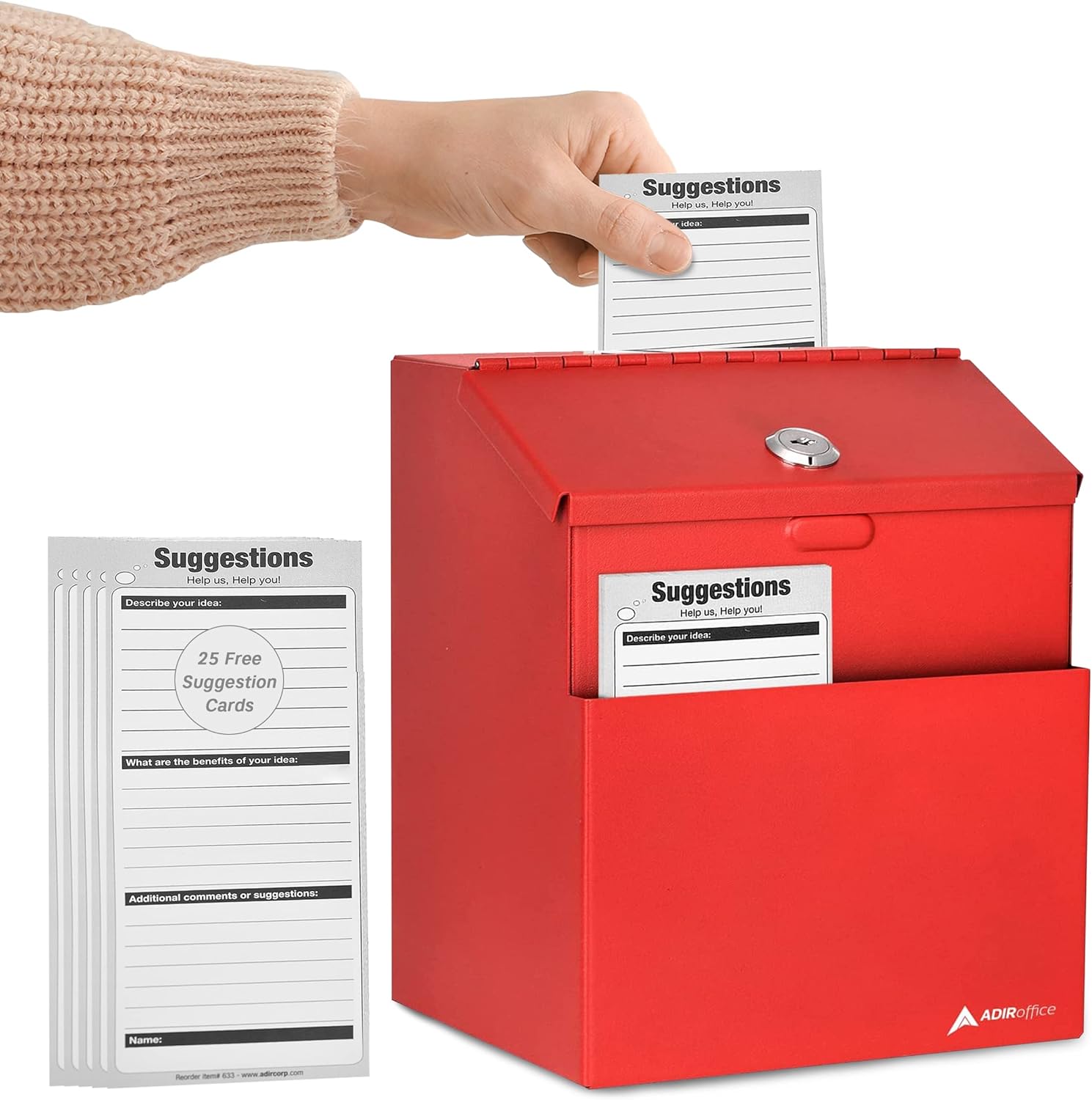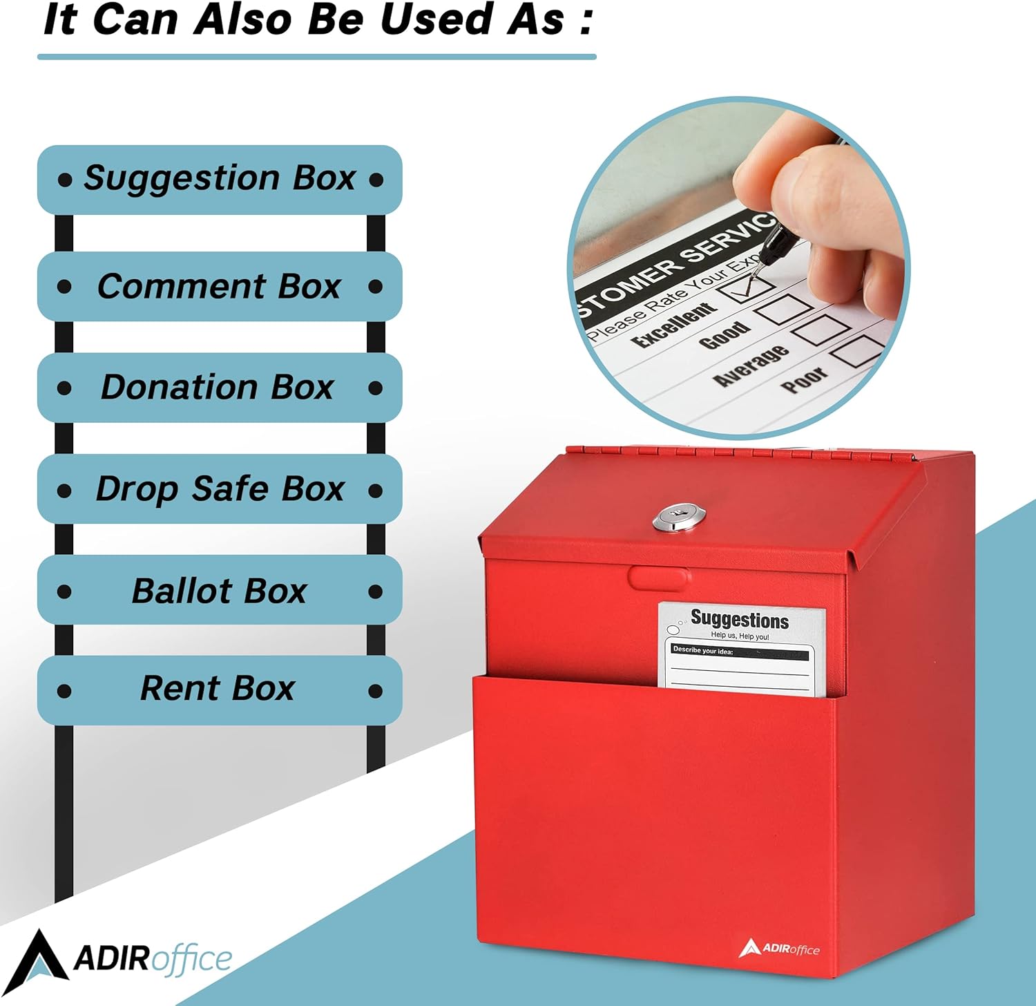 - ✔️Get More Bang for Your Buck: AdirOffice wall mount donation boxes for fundraising and charity comes with 25 Suggestion Forms / Cards, Stick-on labels, 2 Locking Keys for added security