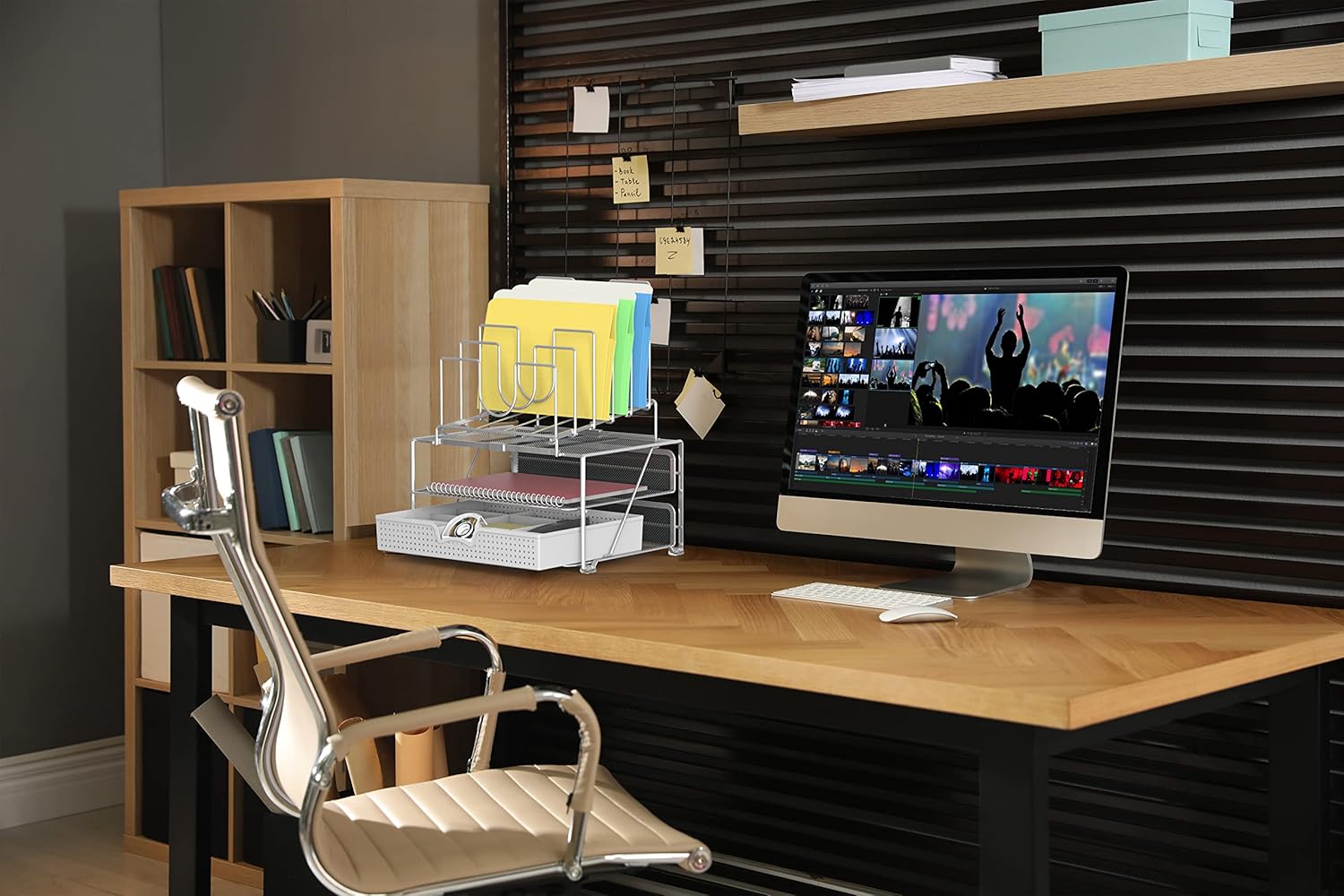 - 1 sliding drawer with 6 adjustable dividers to organize office supplies.