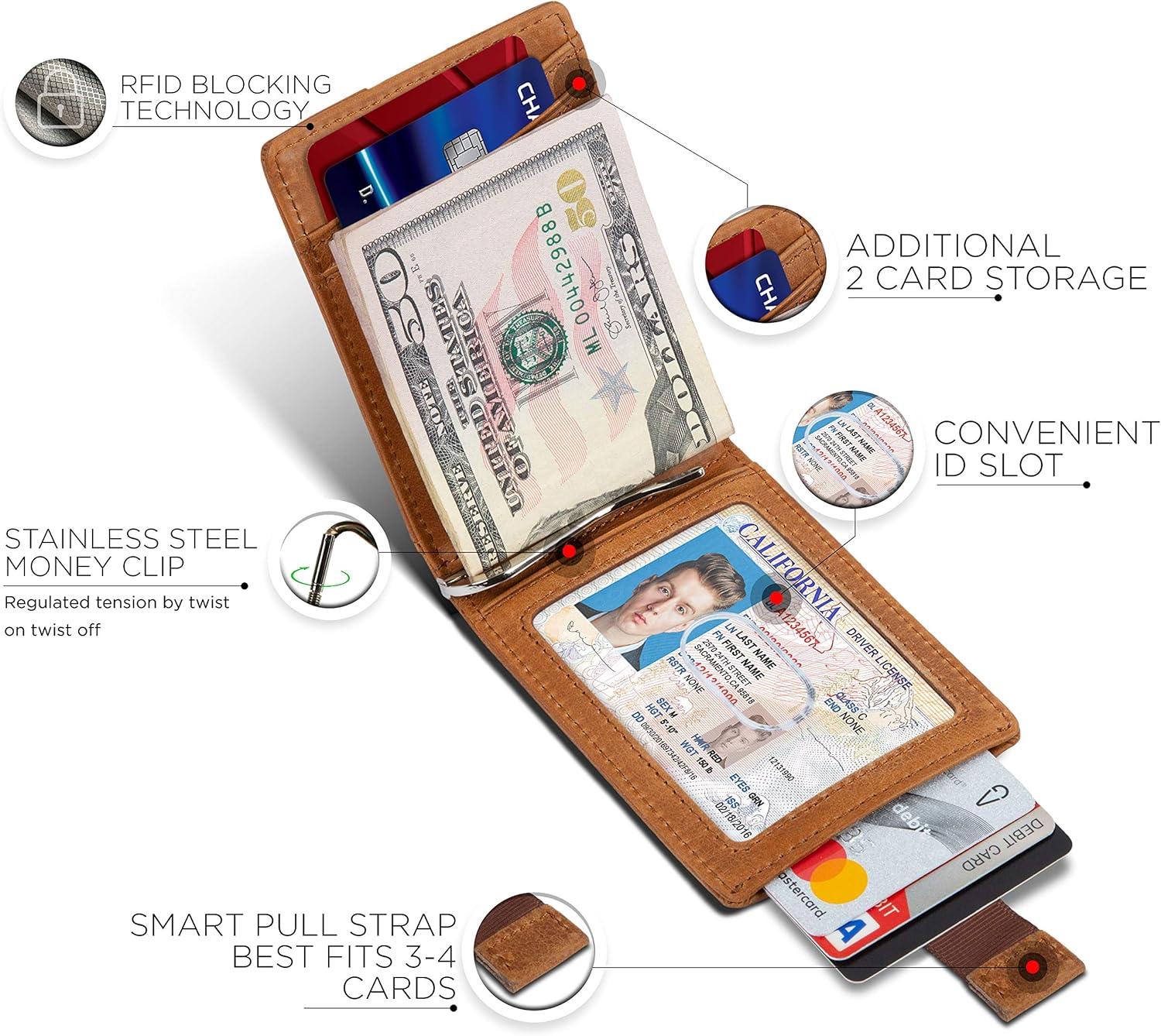- SLIM AND STYLISH - Made with the Finest Full Grain leather, Top Grain Leather and Vegan Leather. Designed Quick Access ID Windows, Best Fits 6-8 cards plus US bills with no bulk, and a minimal Pull-tab design to reduce bulk - Wallet Size: 3.9" in. x 2.85" in. 0.5" in.