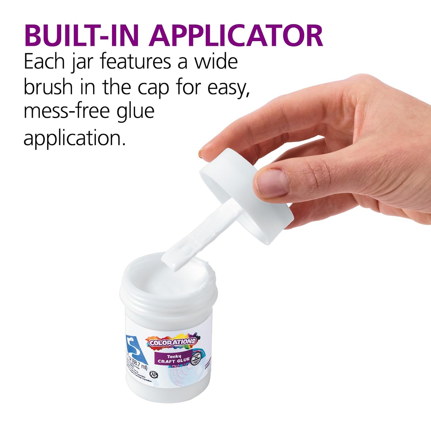 Colorations® Tacky Craft Glue Classroom Pack Jars, Each with Built in Brush Applicator, Set of 12, Each 3oz, Thick & Strong Tacky Glue, Dries Clear, Use at School, Home, Office & Craft Projects