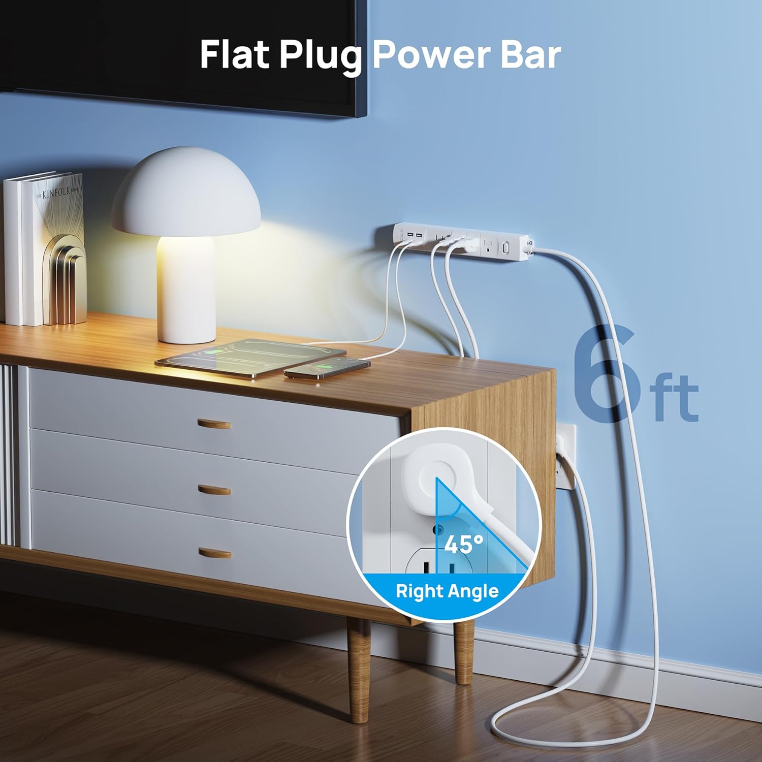 - 6ft Extesion Cord: This flat plug power strip comes with 6ft flat extension cord (1625W, 125V/13A), helping you get rid of tangling cords and cable clutter. The portable and slim size make it suitable for home office desktop workbench dorm room, etc.