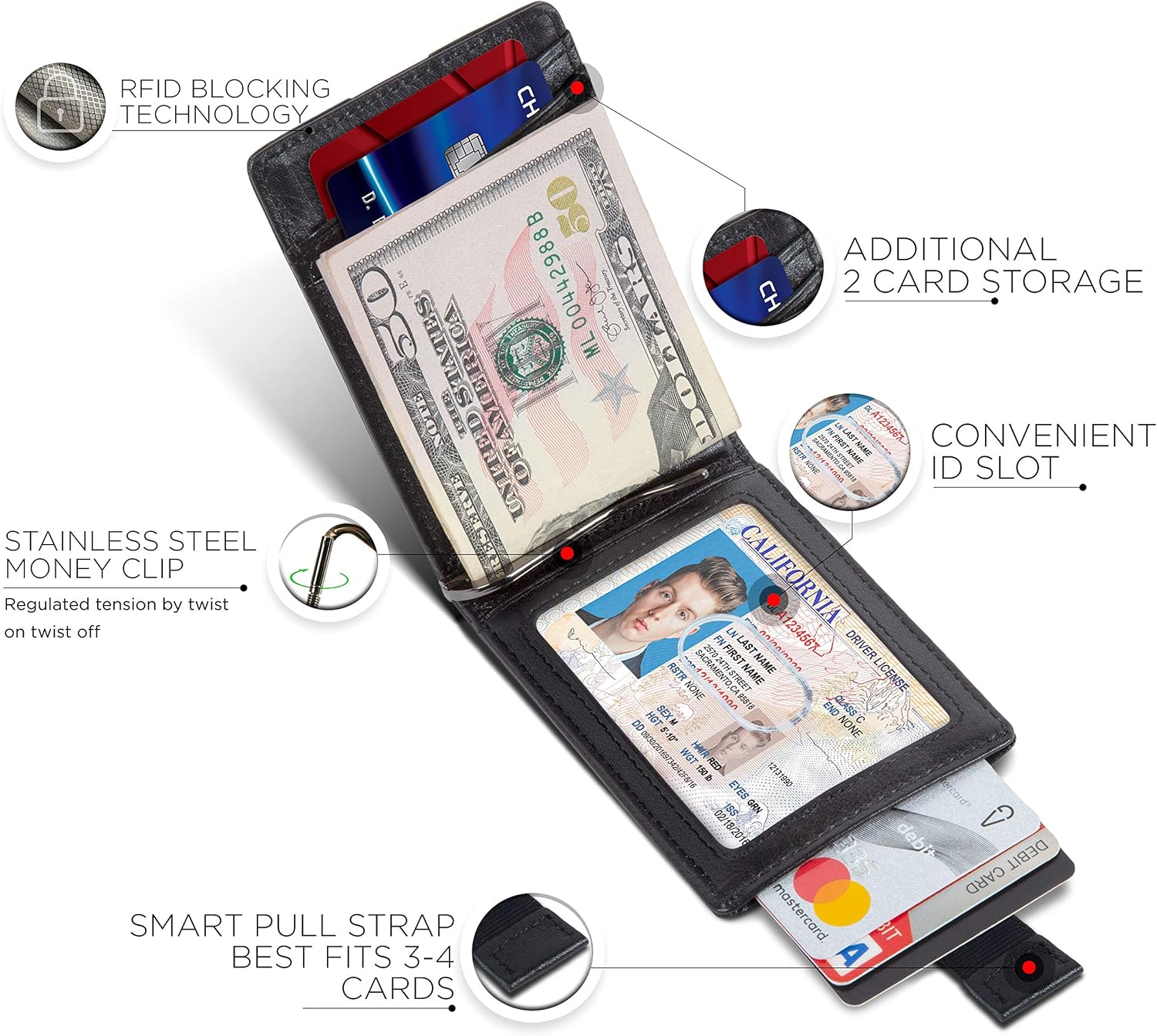 - SLIM AND STYLISH - Made with the Finest Full Grain leather, Top Grain Leather and Vegan Leather. Designed Quick Access ID Windows, Best Fits 6-8 cards plus US bills with no bulk, and a minimal Pull-tab design to reduce bulk - Wallet Size: 3.9" in. x 2.85" in. 0.5" in.