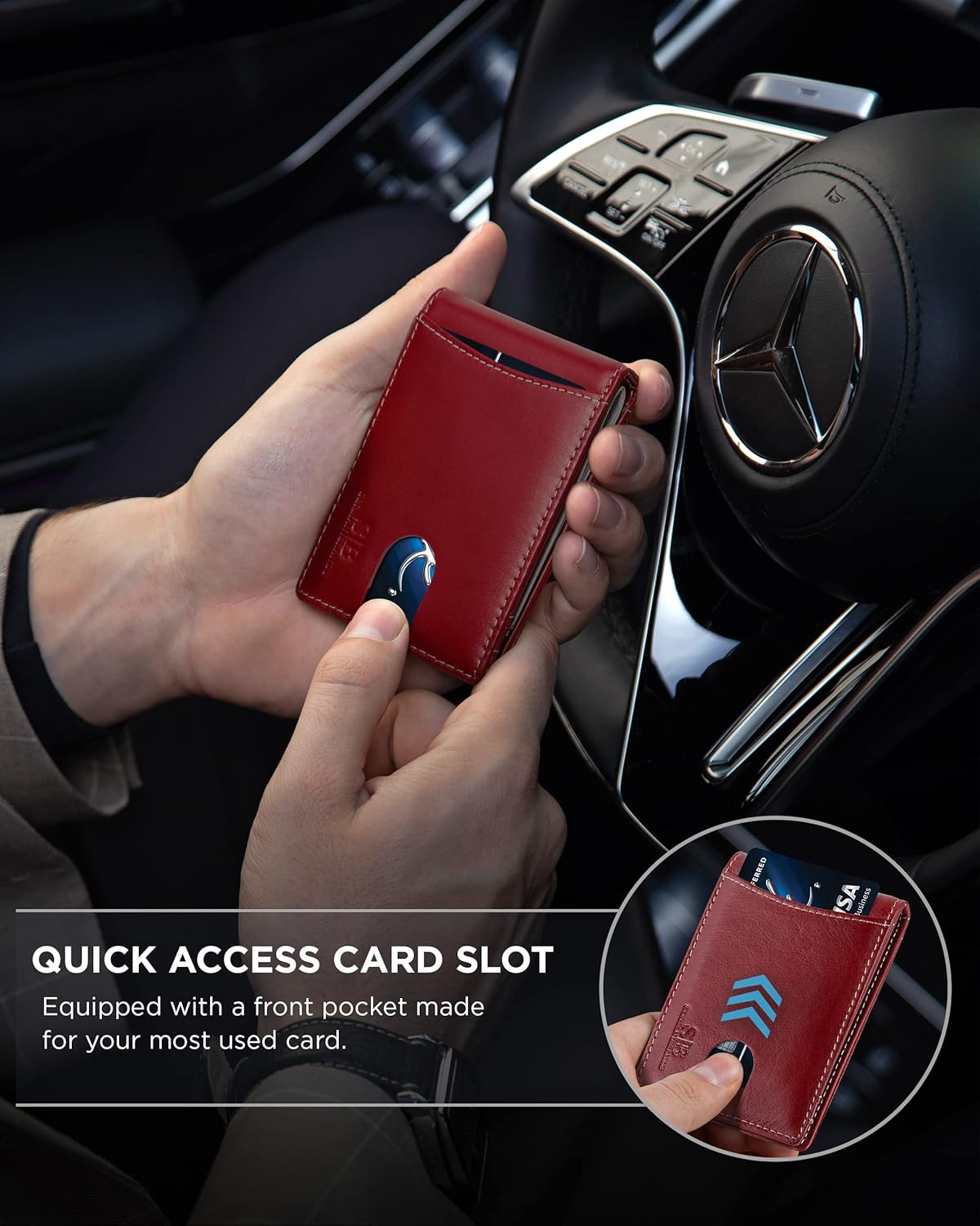 • SLIM AND STYLISH - Made with the Finest Full Grain leather, Top Grain Leather and Vegan Leather. Designed Quick Access ID Windows, Best Fits 6-8 cards plus US bills with no bulk, and a minimal Pull-tab design to reduce bulk - Wallet Size: 3.9" in. x 2.85" in. 0.5" in.