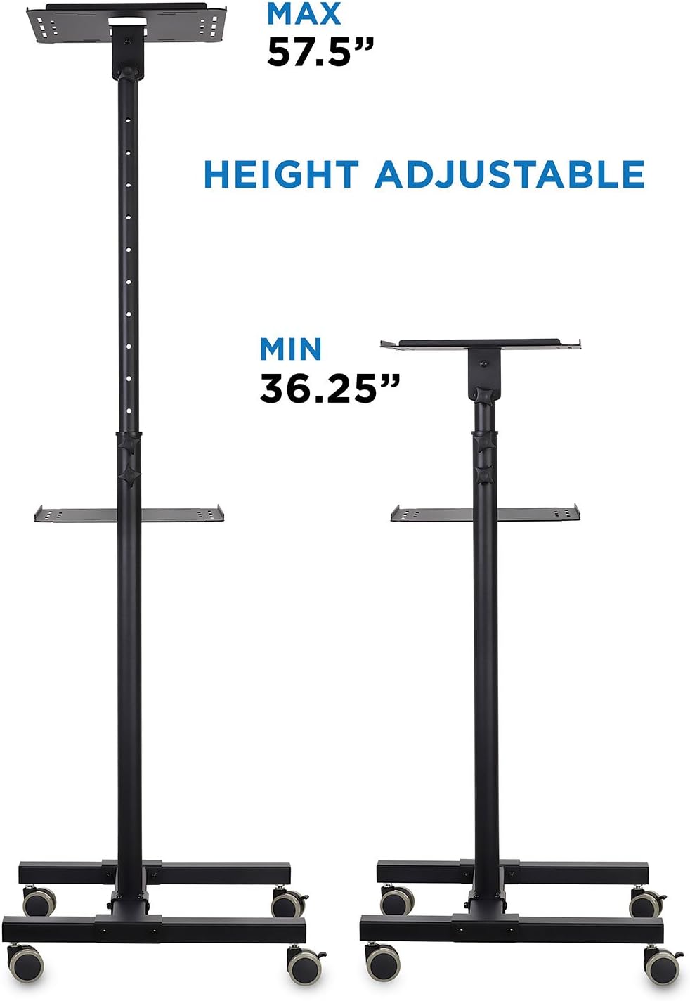 - TALL ADJUSTABLE PROJECTOR STAND: Easily adjust the height up to 57.5" with the top tray able to conveniently tilt up to 30° in both directions and the bottom tray able to adjust in height.