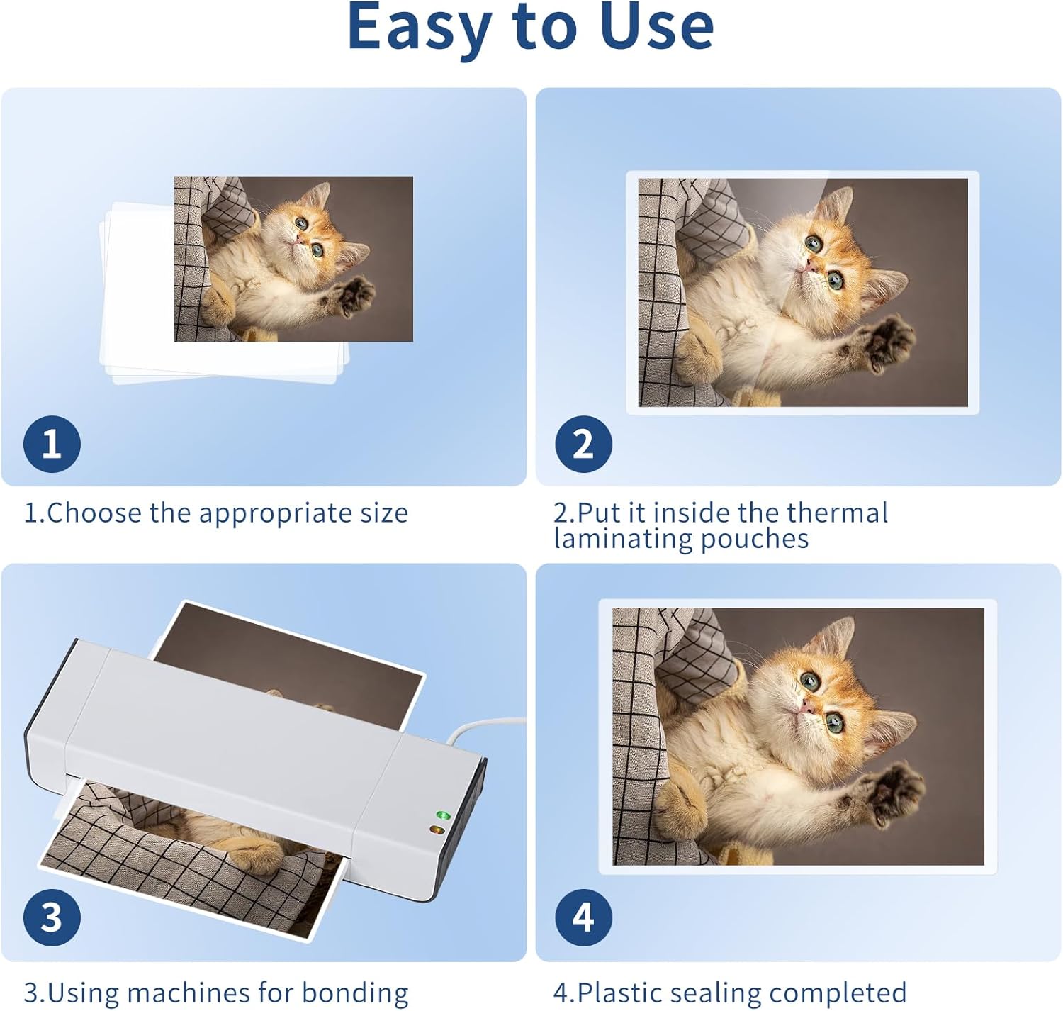 - Easy to Use: Compatible with all laminator brands. Place the photo in the center of the pouch, put it into the laminating machine.
