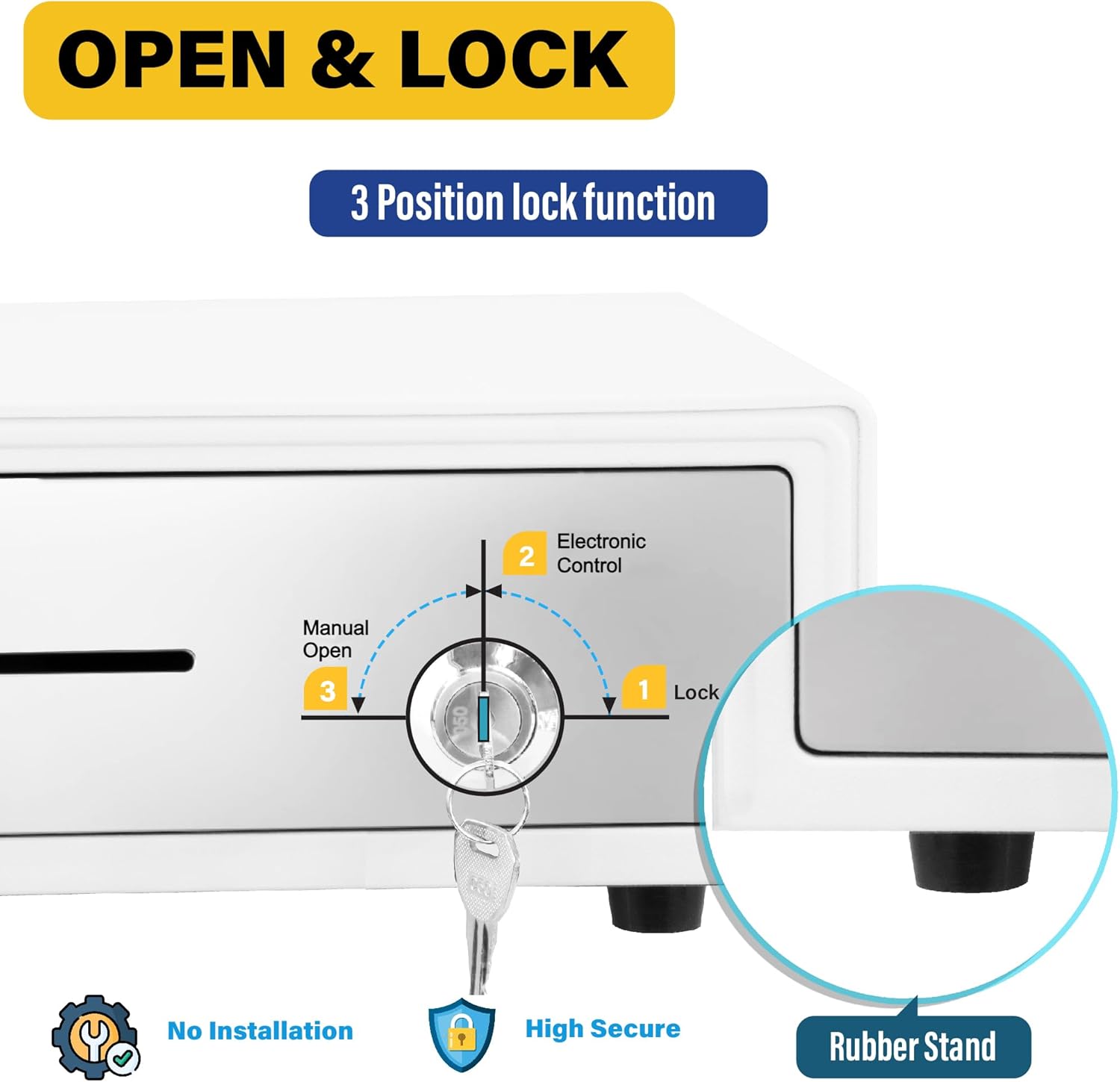 - 💳3-Position Lock& Single Large Front Media Slot: This cash drawer ensures the highest level of security with a 3-position lock mechanism: 1-Lock, 2-Auto Open by Printer/POS, 3-Manual open