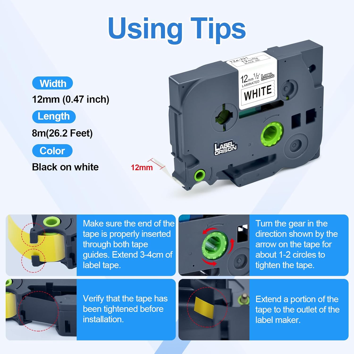 Label Orison 4PK Compatible with Brother P Touch Label Tape TZ Tape TZe-231 TZ231 TZe231 TZo231 1/2 inch Black on White Standard Laminated 12mm 0.47 Tapes