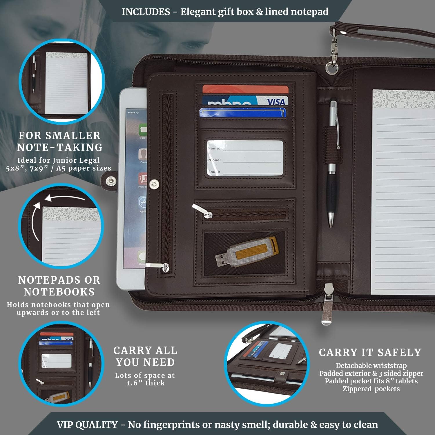 - COMPACT - Bring your essentials with you in this leather portfolio folder including your 8 inch tablet (e.g. iPad Mini) plus Junior Legal (5x8"), A5 notepad, 6" x 9" Steno-Pad - or any notebook up to 6.5x9.5" (e.g. Rocketbook Wave Executive) even though the padfolio is over 35% smaller than standard US Letter-sized portfolios.