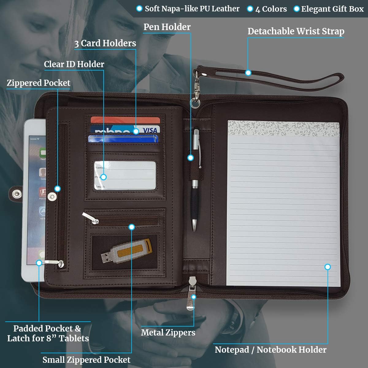 Zippered Portfolio Binder with Junior Legal 5x8 Notepad - Dark Brown PU Faux Leather Business Padfolio Organizer Folder with 8 Inch Tablet Sleeve & Gift Box by Lautus Designs