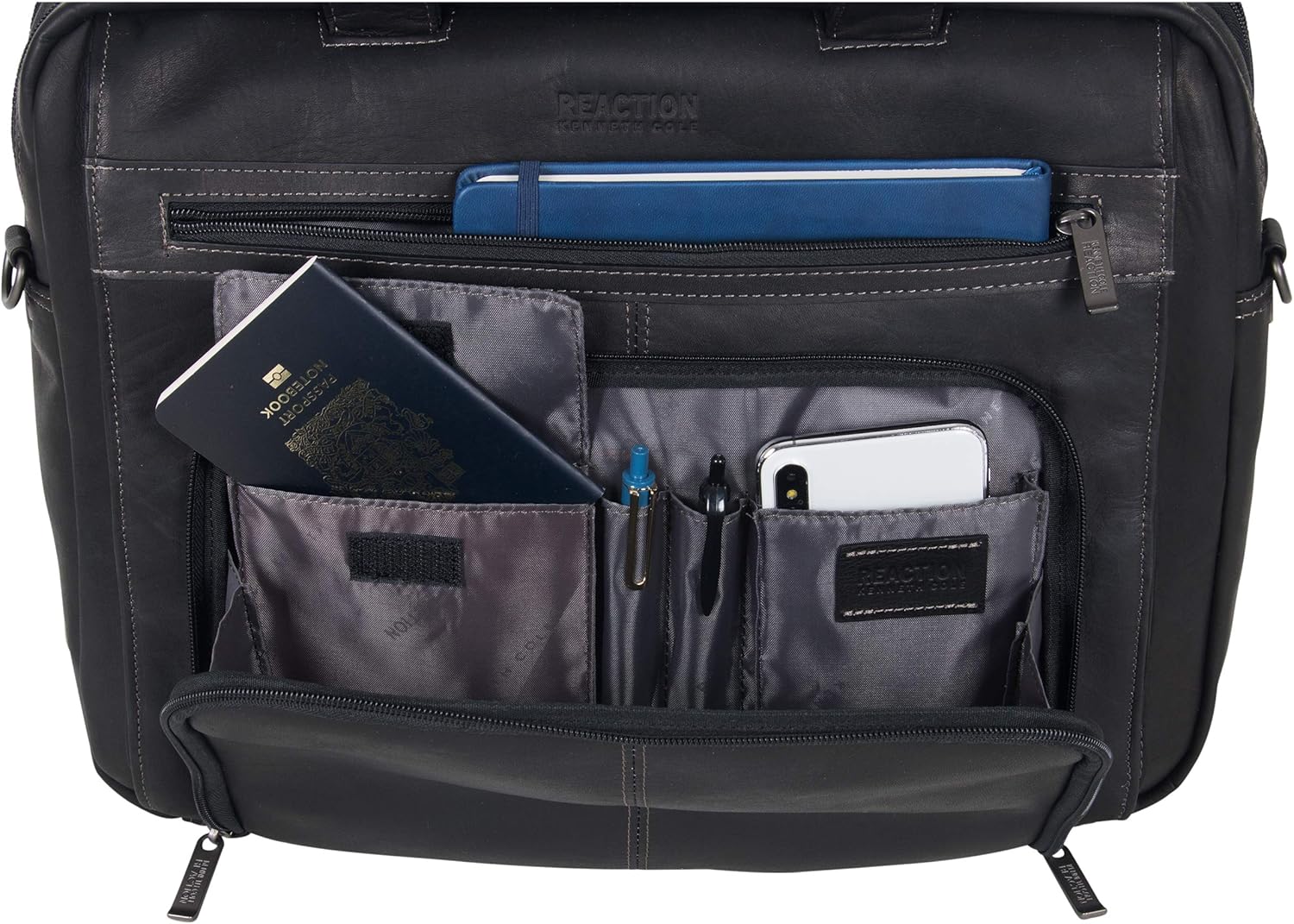 - Interior features multiple storage accessory pockets, a padded laptop pocket that fits most laptops with up to a 15.6” screen, a padded tablet pocket, and a file divider in the rear compartment. Front compartment organizer features anti-theft RFID shielding fabric to block radio waves from being transmitted from U.S. passports and certain credit/debit cards.