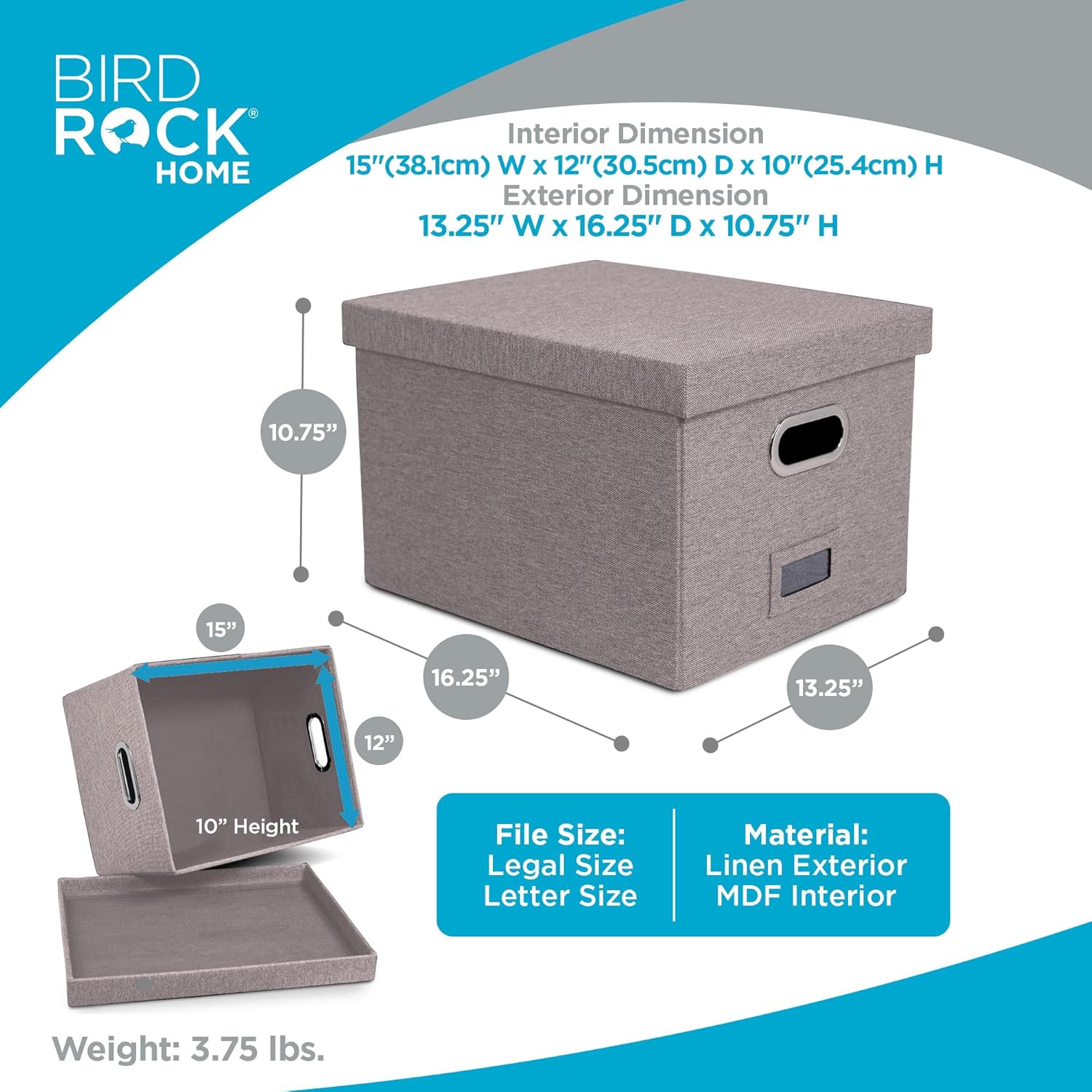 - INCLUDES 2 FILE BOXES. *FILE FOLDERS NOT INCLUDED. DIMENSIONS: Interior Dimensions: 15"(38.1cm) Width x 12"(30.5cm) Depth x 10"(25.4cm) Height; Exterior Dimensions: 13.25" Width x 16.25" Depth x 10.75" Height