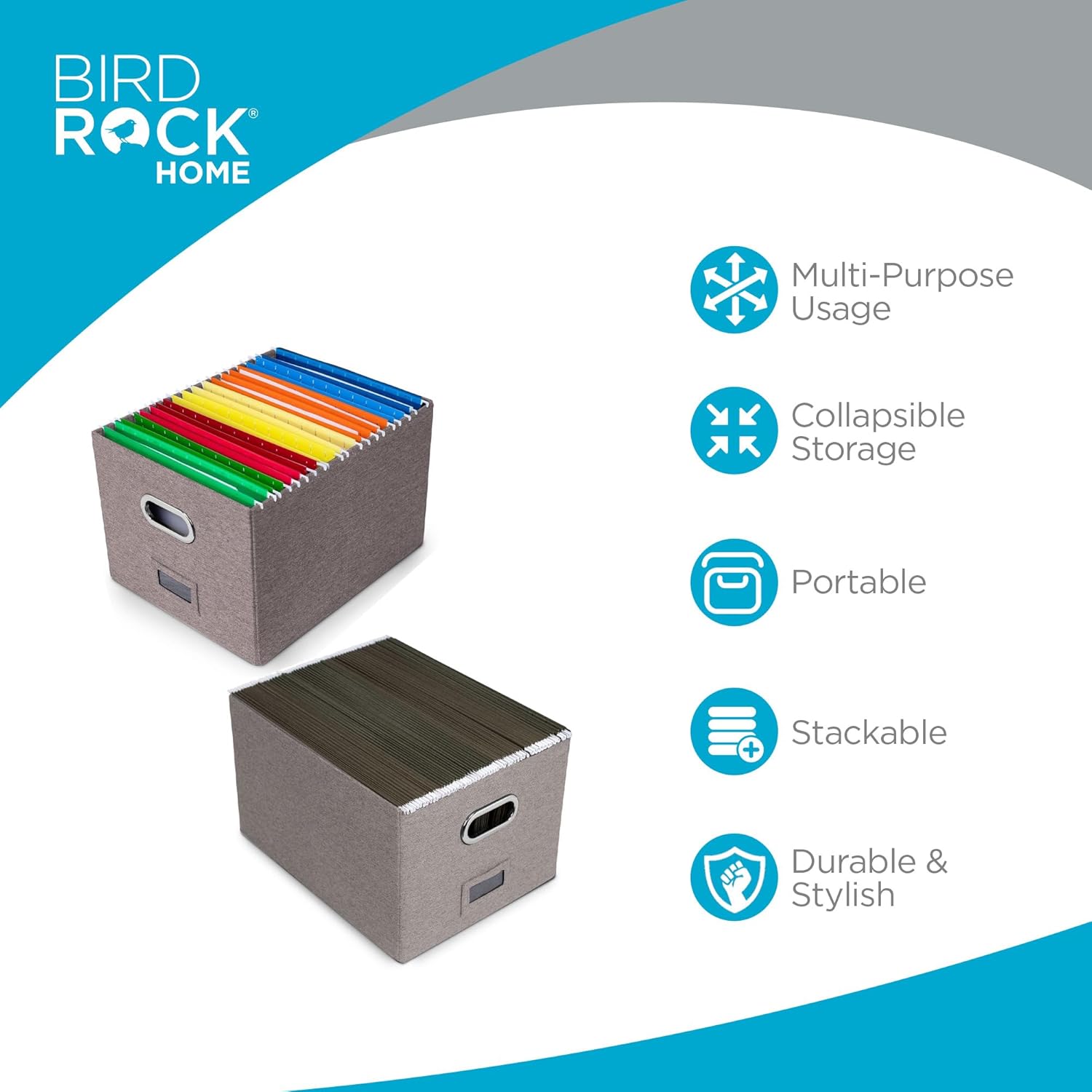 - PORTABLE - STACKABLE - VERSATILE: The collapsible storage file bin is equipped with easy access carrying handles and is extremely durable for stacking multiple filing boxes on top of one another. Equipped with a label window for simple organization and may be used for storing toys, closet accessories and other items outside of files.