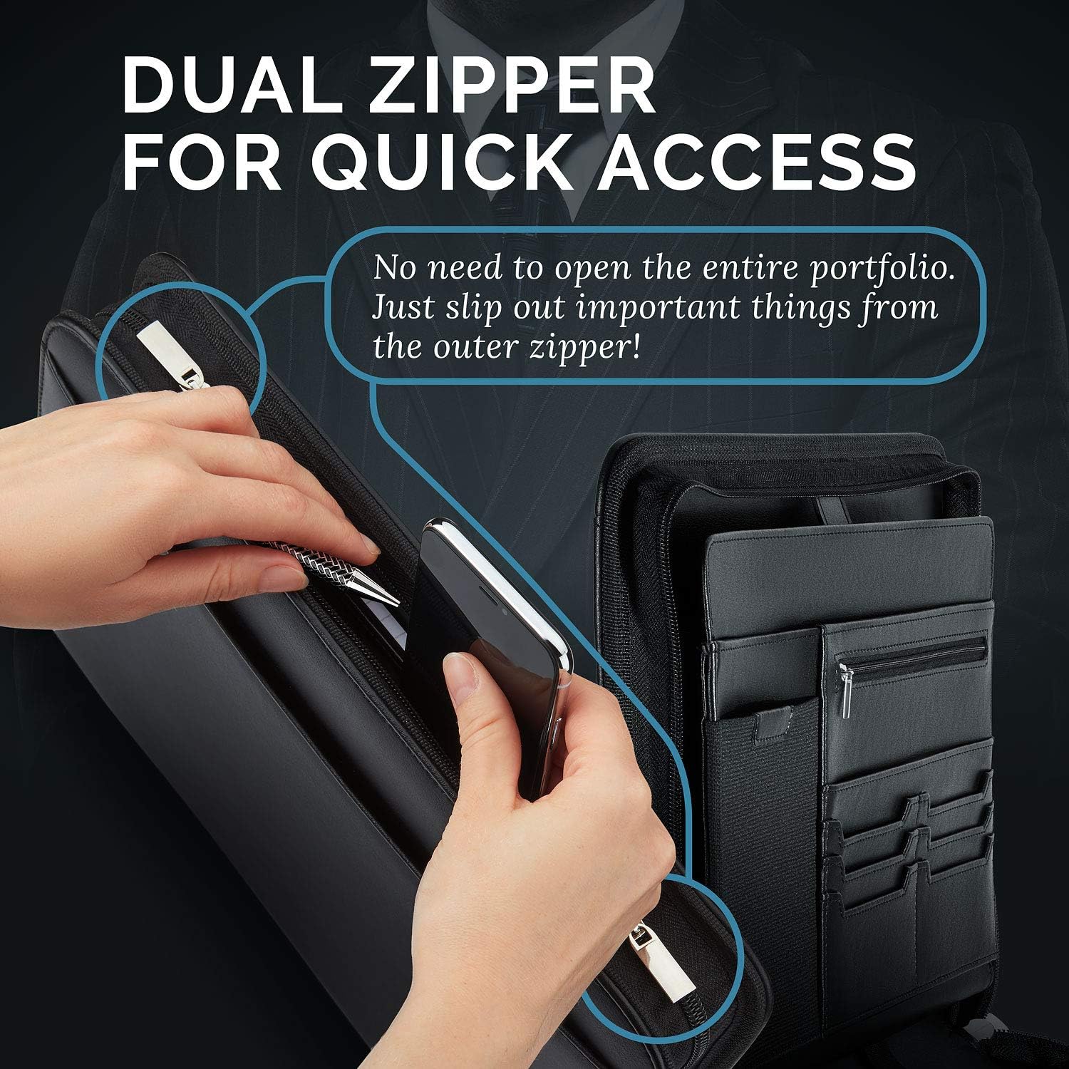 - 👔💼 DESIGNED TO PERFECTION - STAY NEAT & ORGANIZED: This neat leather notepad holder It’s has a dual zipper for extra convenience & accessibility, 12 convenient interior pockets plus 1 exterior pocket for documents, including 6 business card holders, a zippered pocket for extra safety, 2 pen holders, one of which is big enough for 1 large or 2 standard pens, special-made padded universal 12.5-12.8in sleeve for iPad / tablet, phone sleeve big enough for the largest iPhone/phone & much mor