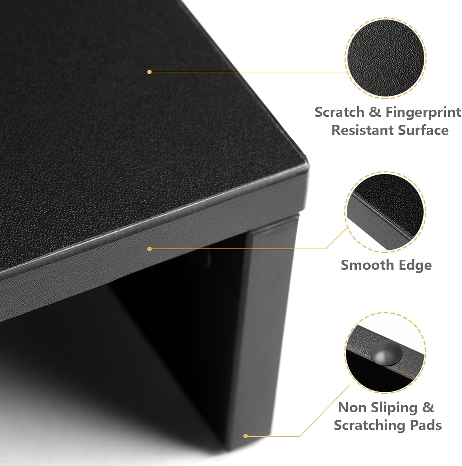 - TIDY & EFFICIENT: Our sturdy computer monitor riser can hold two/three monitors even in a small space. It is your good helper if you have more than one monitor to manage. There are also three storage spaces underneath the rack, keeping all the stuff an home or office within reach such as TV, PC, PS5, laptop, phone, headset, keyboard, mice, printer, note pad, stapler, tape dispenser and tiding up the entire area nicely.