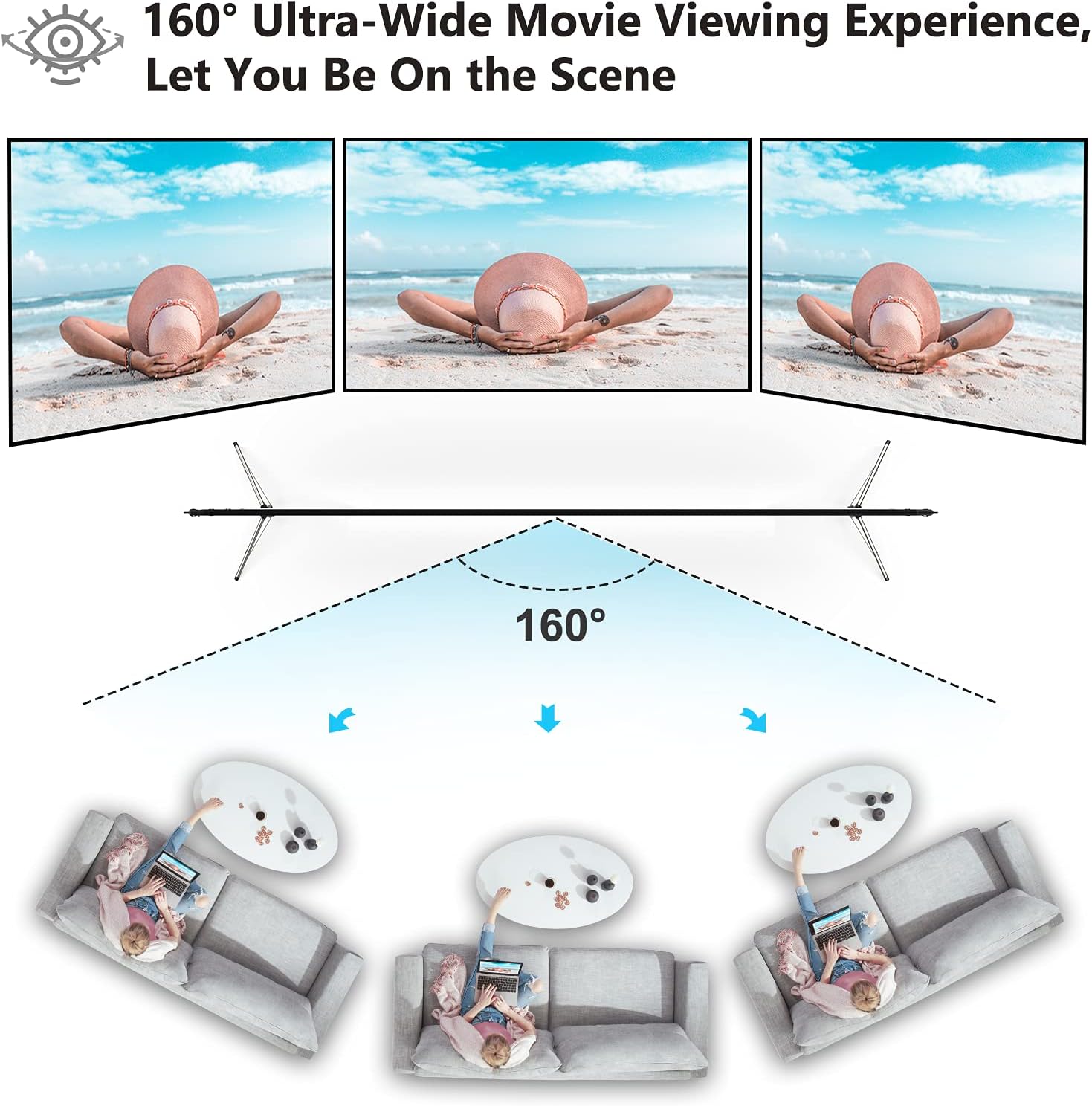 - [Excellent Projection Display]- 100-inch movie projector screen with stand, 16:9 aspect ratio, and 160 degrees wide viewing angle. The Vamvo portable projector screen will become your projector and your best friend. The movie screen is designed to provide clear, high-resolution images, rich colors, and an excellent viewing experience in different viewing positions. When using it, you'll feel like you're in a movie theater whether you're by yourself or sharing a fun time with family and friends.