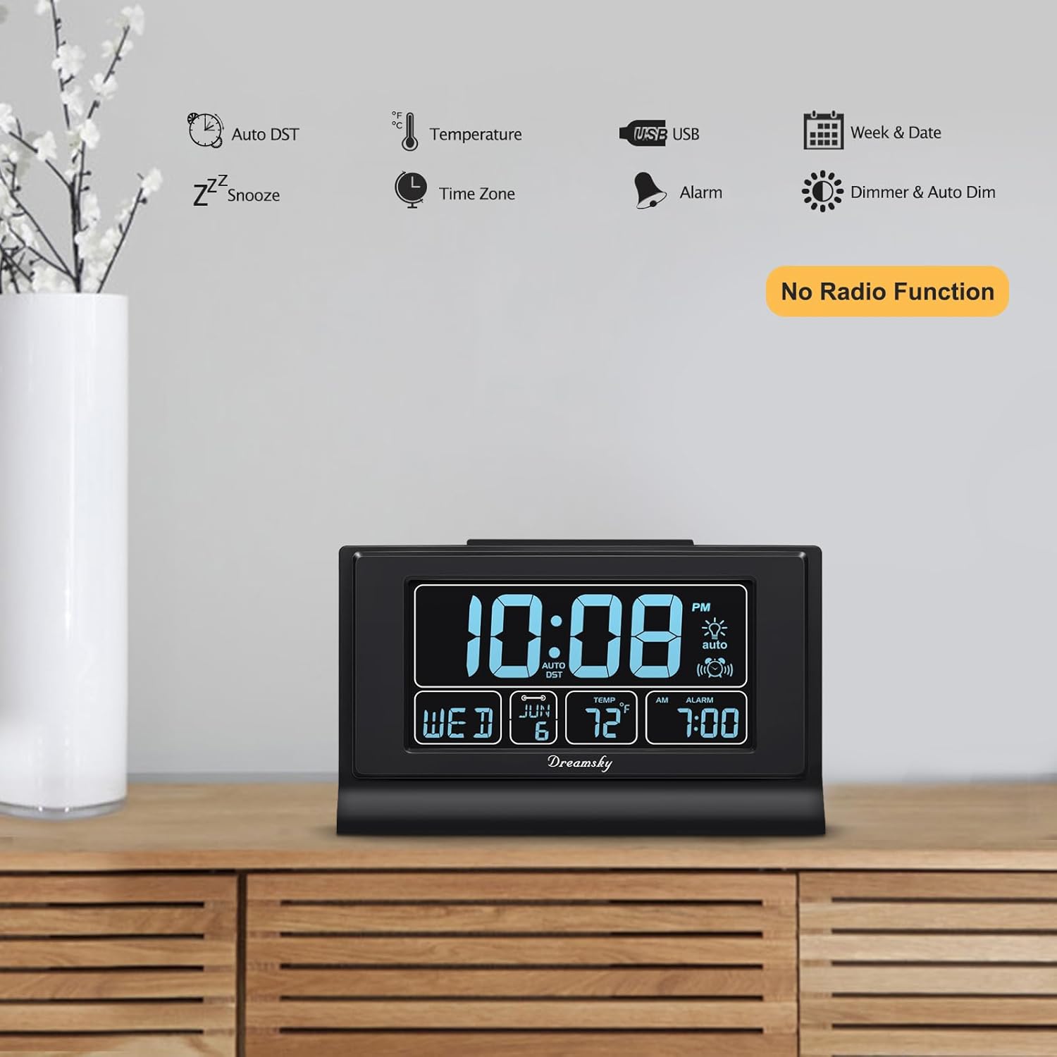 DreamSky Alarm Clocks for Bedrooms with Battery Backup, Auto Set Digital Clock with Date and Day of Week, Temperature, USB Port, Auto DST, Dimmer, 12/24H