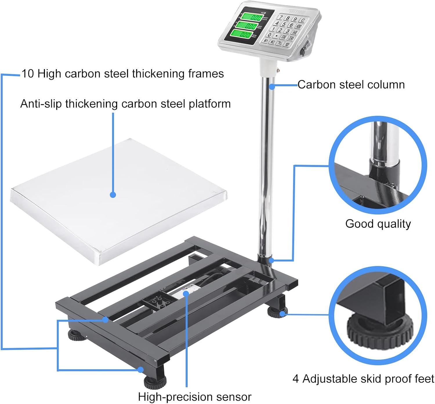 - 【Top Quality】-- The stainless steel weighing platform measures 15.7''Lx19.7''W, sturdy and wide platform accommodates various items. 4 Adjustable skid proof feet for keeping the platform balance. Detachable design makes it easy to carry and store, saving space.