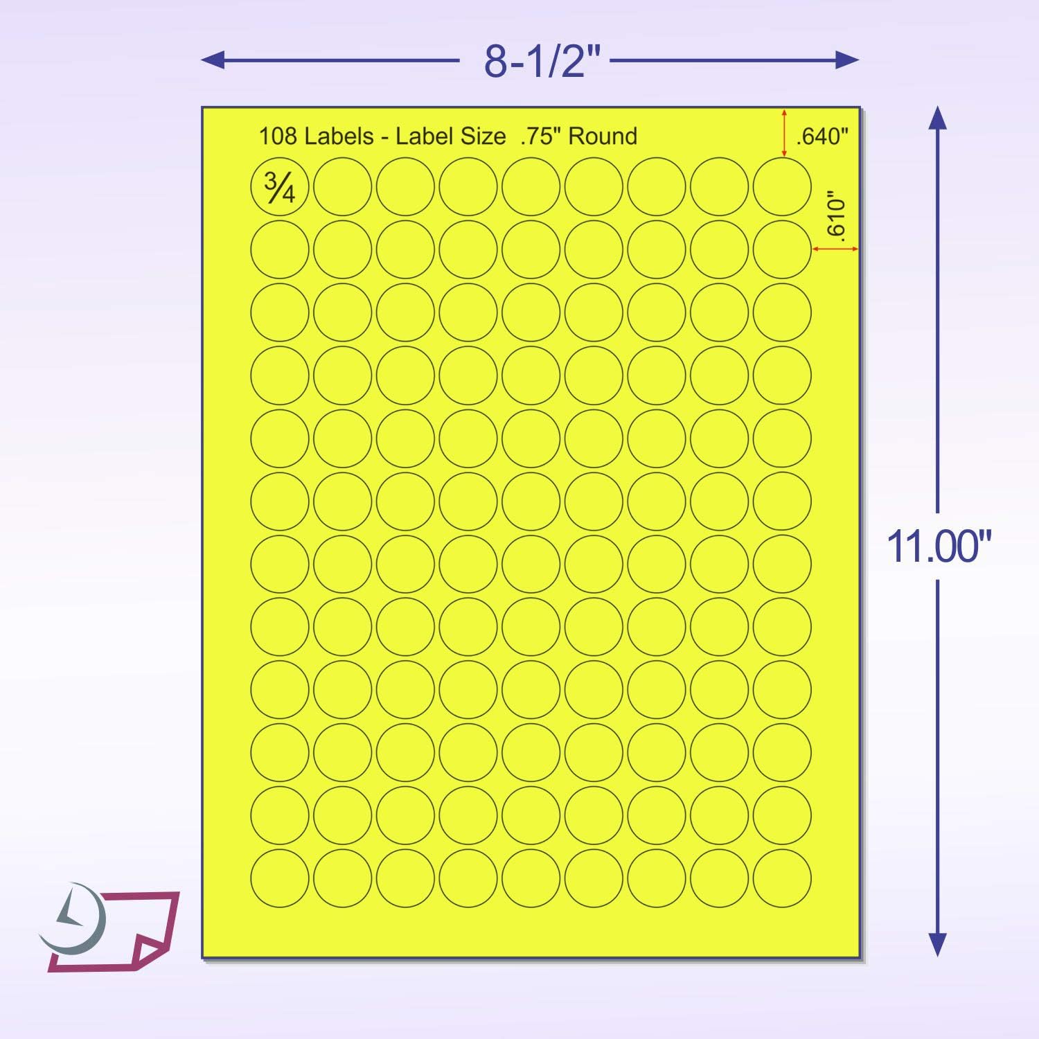 8-1/2 x 11" Neon Color High Light Fluorescent Labels for Laser & Inkjet Printer (Yellow Fluorescent, 3/4" Round - 108 Per Page | 2700 Labels)