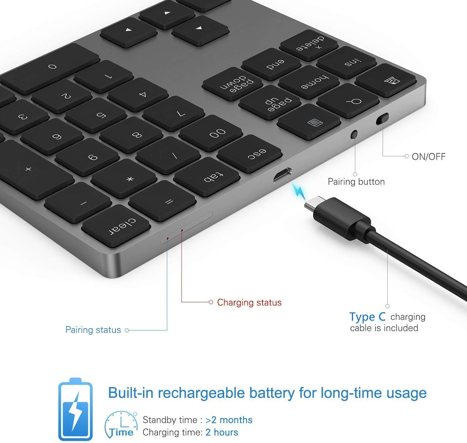 - High-Capacity Rechargeable Battery: Built-in 160 mAh lithium rechargeable battery. The Bluetooth numeric keypad is easily recharged through the included type C cable, no need to change the battery and easy to use. The Bluetooth wireless keypad also has the auto sleep function, lower power consumption, reflect energy saving and humanization of the product. Press any key can wake up the Bluetooth number pad within 3 seconds