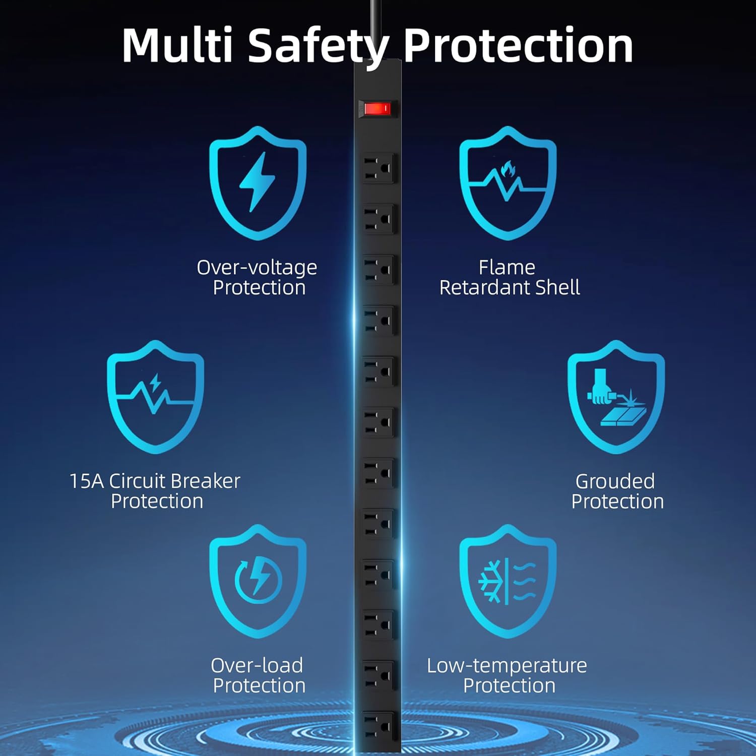 12 Outlet Long Power Strip with 15A Circuit Breaker,Black Wall Mount Heavy Duty Power Strip with 6FT/14AWG/15A/125V Extension Cord for Industrial,Garge,Office,Home and School,Black(6FT)