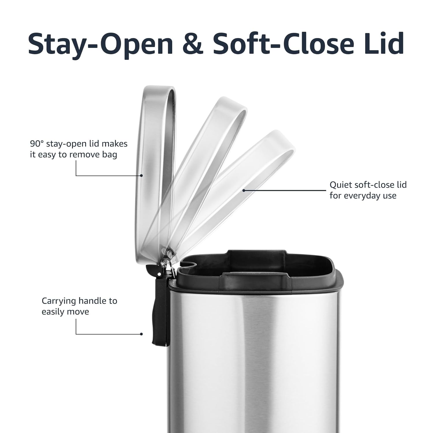 Amazon Basics Smudge Resistant Mini Rectangular Trash Can With Soft-Close Foot Pedal, Brushed Stainless Steel, for Bathroom & small space, 5 L /1.32 Gal, Satin Nickel Finish, 7.3x8.5 x11.8 in (LxWxH)