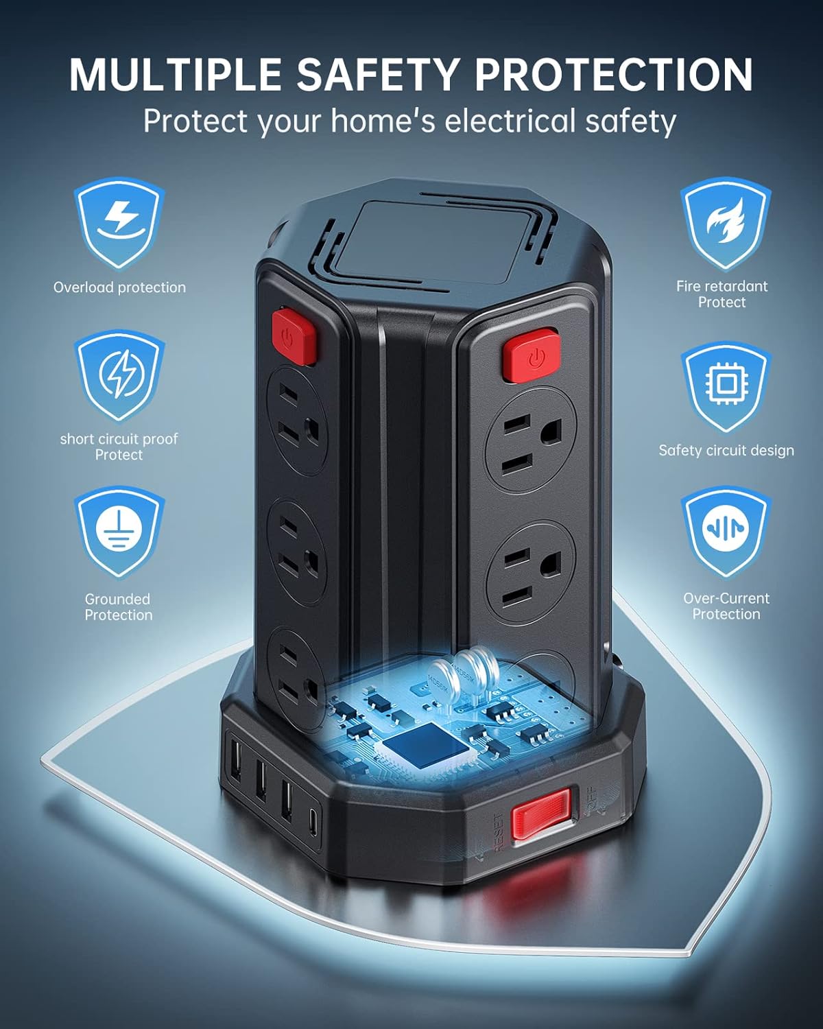 - 【4-Separated Switches and Energy Saver】The extension cord tower has 4-Separated Switches that control 4 parts, making it easy to turn off multiple electronics when not in use; No plugging & unplugging hassle, this 16 in 1 power strip can be your charging station for multiple devices to keep neat and compact.