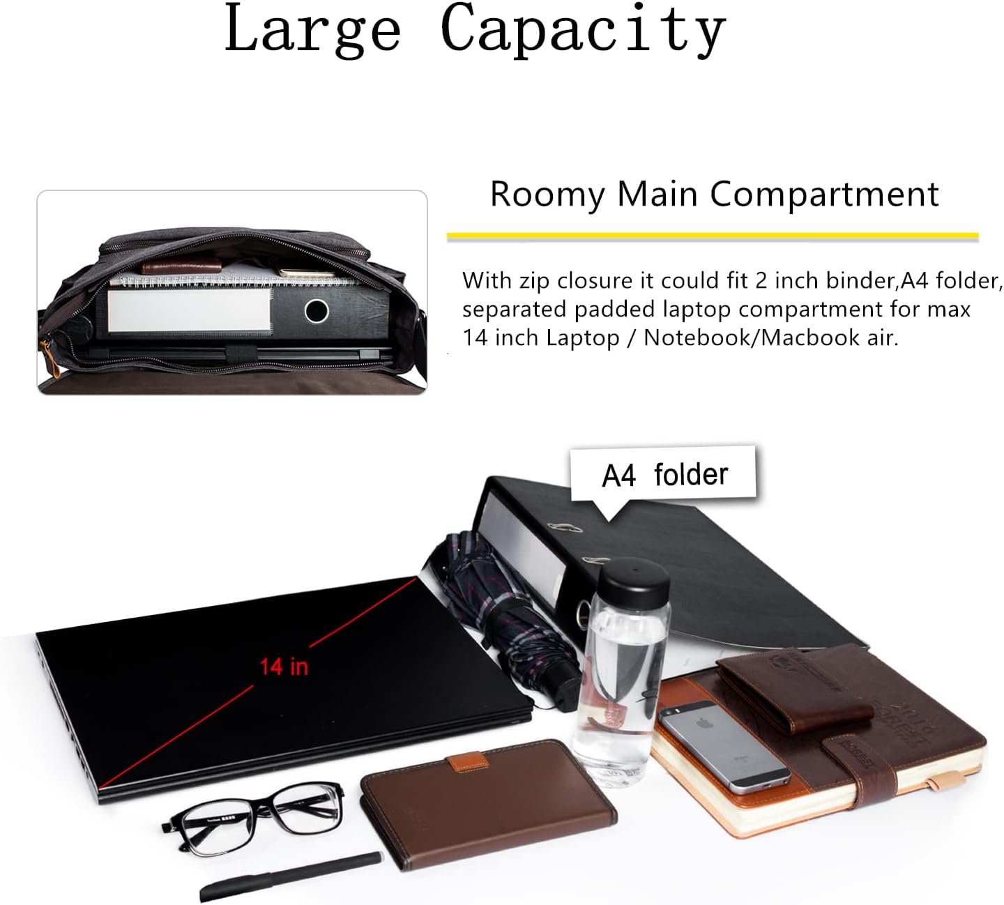- LARGE MAIN COMPARTMENT with zip closure could fit 2 inch binder, separated laptop compartment for max 14" Laptop / Notebook.This messenger bag can accommodate 13-14 inches laptop, can not fit for larger computer. Please measure your laptop before order.