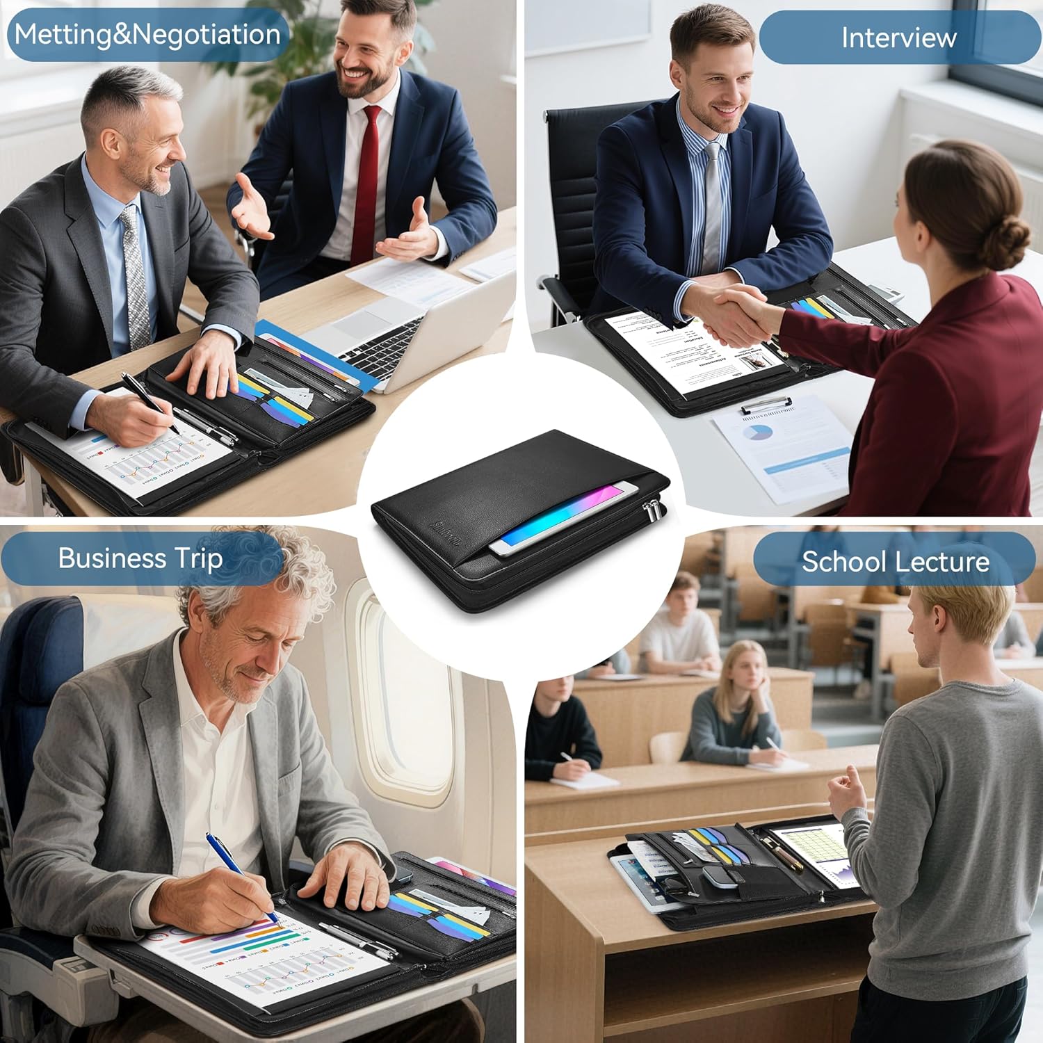 Zippered Leather Padfolio Organizer, Multifunctional Business Portfolio Folder with Zipper, Card Holders Pockets, Notepad Executive File Document Binder for Women Men (Black)