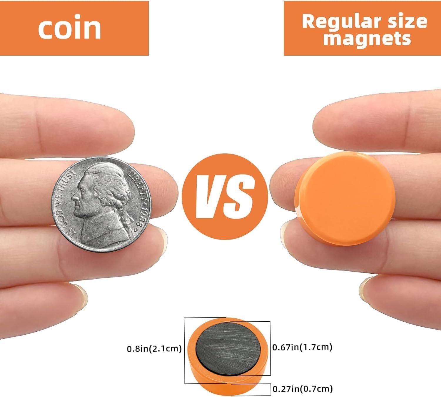 - Value Pack - 50 Colorful Magnets: This set includes 50 round magnets in 10 bright colors, 5 pieces per color. Each fridge magnet measures 0.8 inch (21mm) in diameter and 0.3 inch (7mm) in thickness. Compact but strong, these cute magnets are ideal for everyday use. Not suitable for children under 3. Please keep them away from kids and pets. These locker magnets are not compatible with glass boards or glass magnetic surfaces.