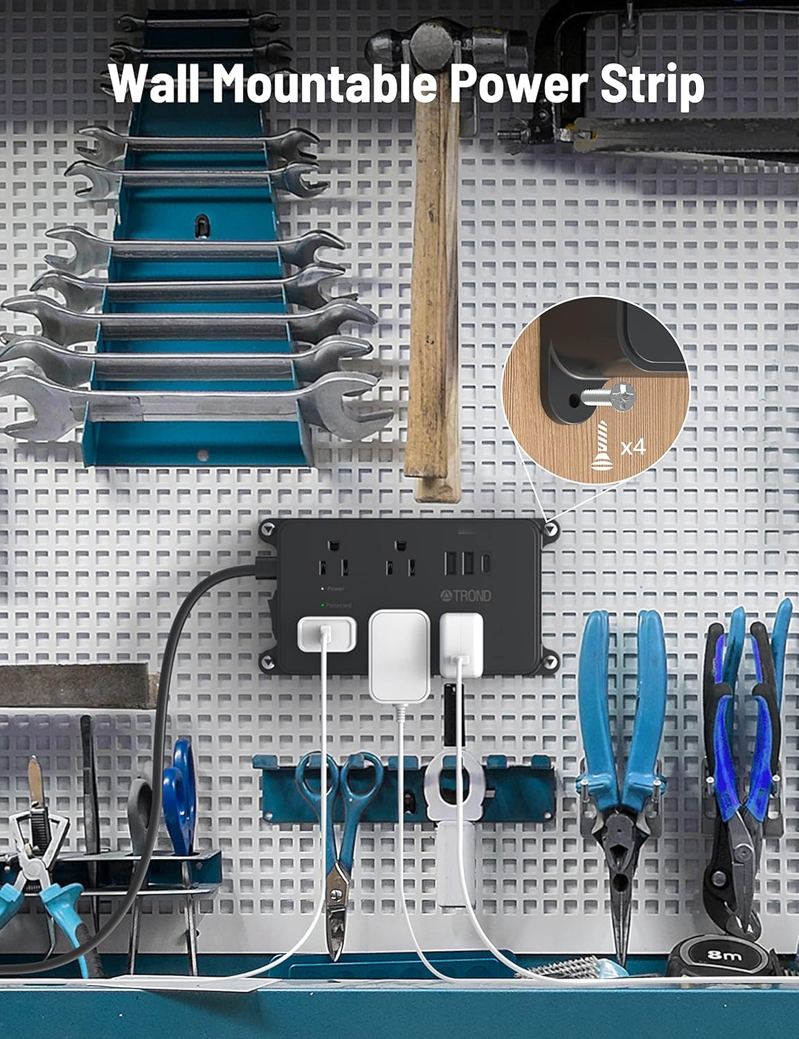 - Wall Mountable Power Strip: This wall mount power strip features a screw-mountable design with four mounting tabs, allowing you to securely install it in easily accessible locations such as behind the TV, on a workbench, in the garage, bedside, bathroom, laundry room, or under a desk or cabinet. Its low-profile design helps save valuable desktop space