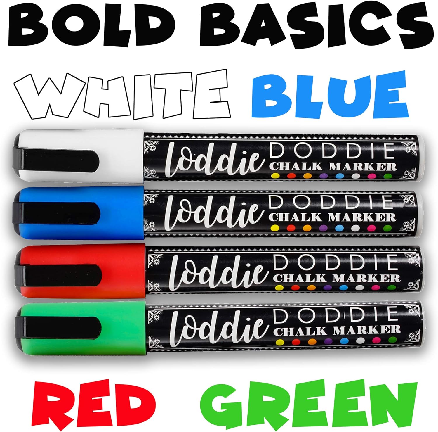 Loddie Doddie Liquid Chalk Markers - 4-Pack Basic Colors 6mm Reversible Tip - Erasable Multi-Surface Chalkboard & Window Markers for Glass Washable