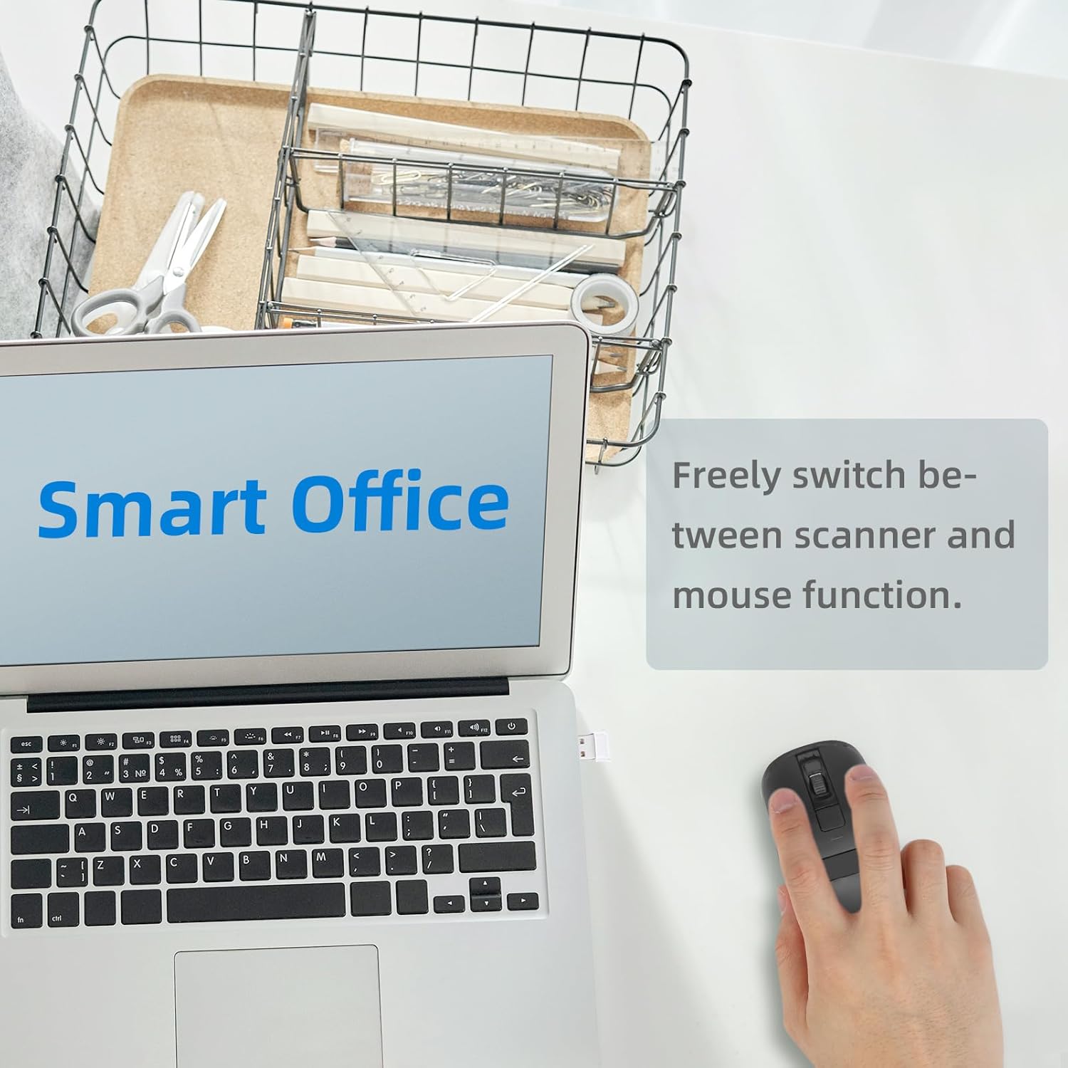 - With Wireless Barcode Scanner and Wireless Mouse Double Functions,Take It Up As a Scanner,Put It Down As a Mouse.Switch Freely, Convenient and Fast. (PS: if can't turn on the scanner or the scanner beeps continuously, please use the USB cable to charging scanner!)