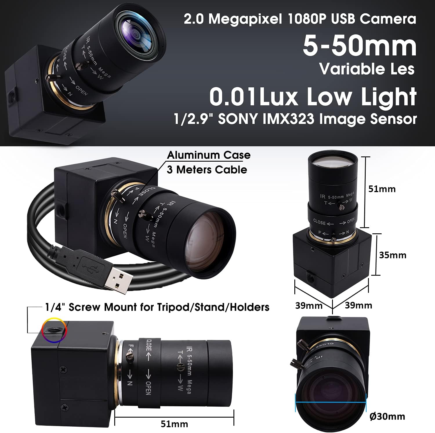 - 【5-50mm Varifocal Lens】2MP USB webcam with 5-50mm varifocal lens, simple zoom and manual focus function. You can focus in close-up or make long distance shots with wide angle, enjoy HD capture in different viewings. The manual adjustments focal length, focus and exposure gives you creative control. CS-mount lens allows you to use it on other devices like microscope