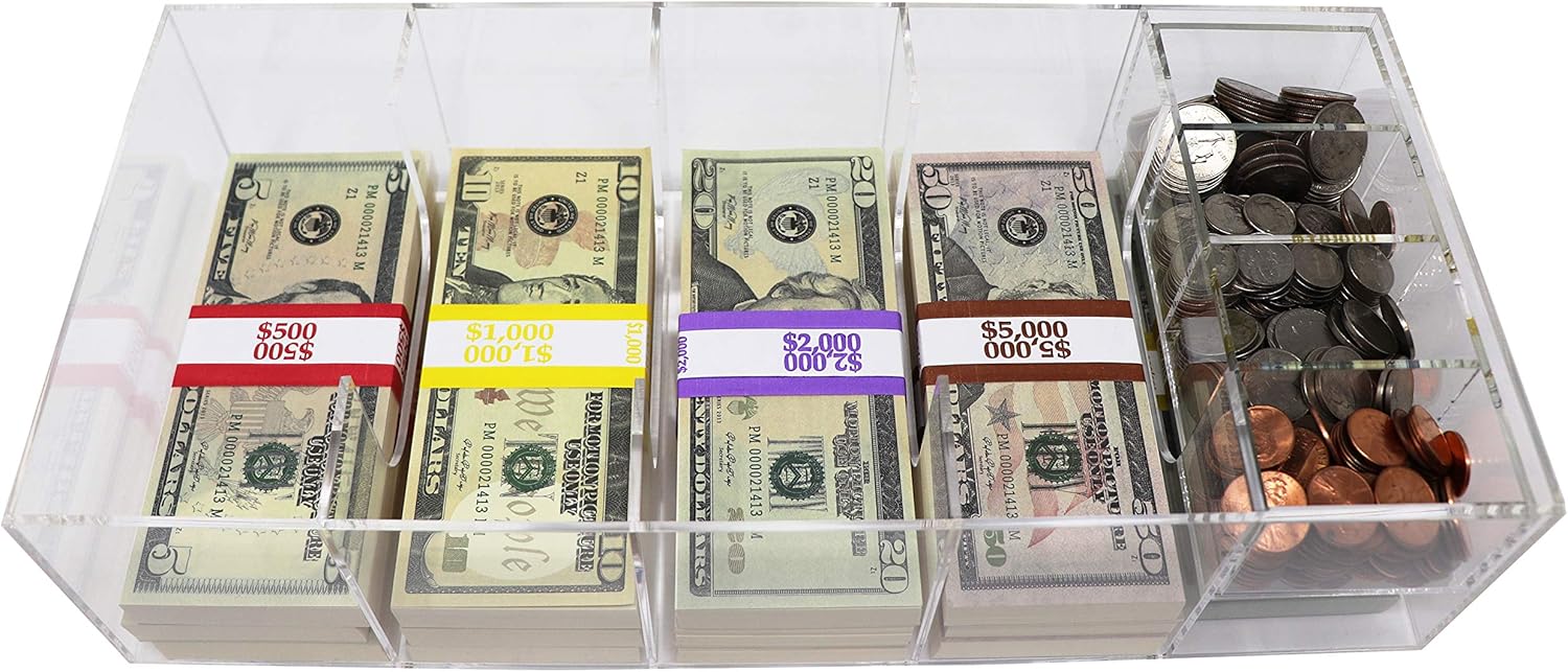 Acrylic Money Tray with Coin Tray Insert, 5 Compartment Clear Cash Organizer Currency Money Storage Box, 300 Money Wrappers Included