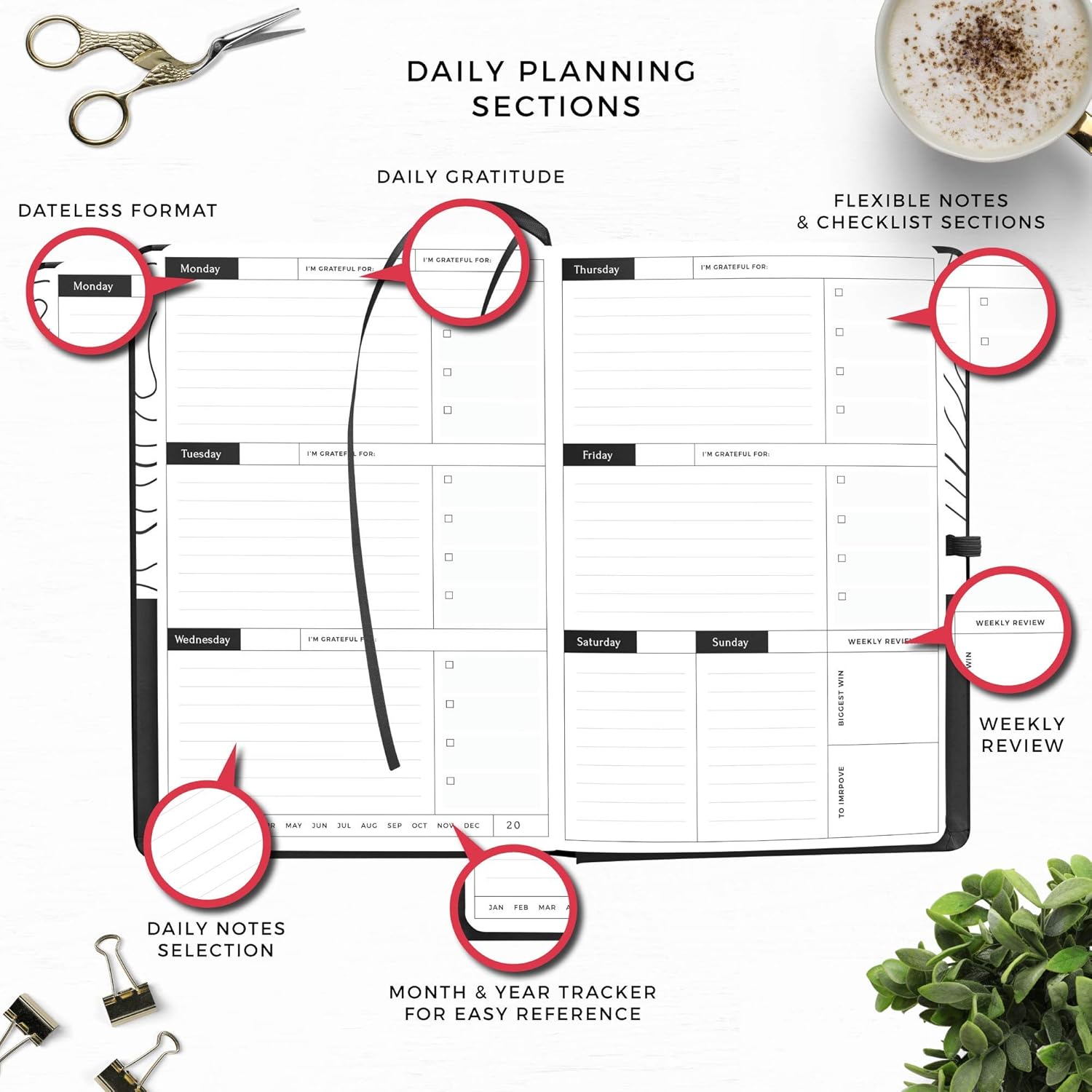 - ✅ VEGAN FRIENDLY, ELEGANT and ATTRACTIVE DESIGN - Our undated daily and monthly school planner would make a great gift for college students. Includes 3 silk bookmarks for multi-section planning, an elastic strap closure and an expandable inner back pocket.