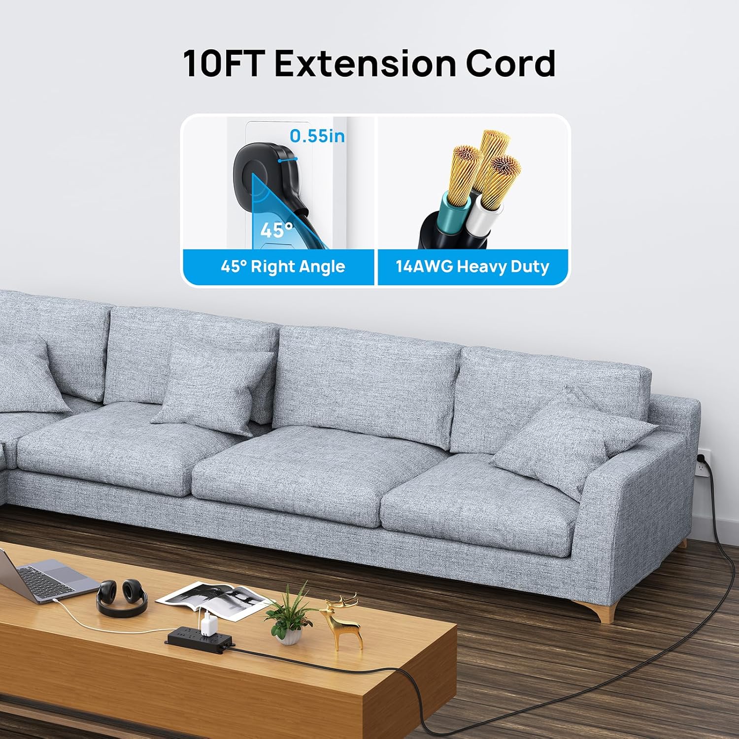 - 10ft Extension Cord Flat Plug: This surge protector is made of 14 AWG pure copper for extra durability, the 10ft extension cord is heavy duty and has better current carrying capacity (15a). The low profile right angle flat plug eliminates awkward cords from cluttering and doesn’t block the bottom receptacle