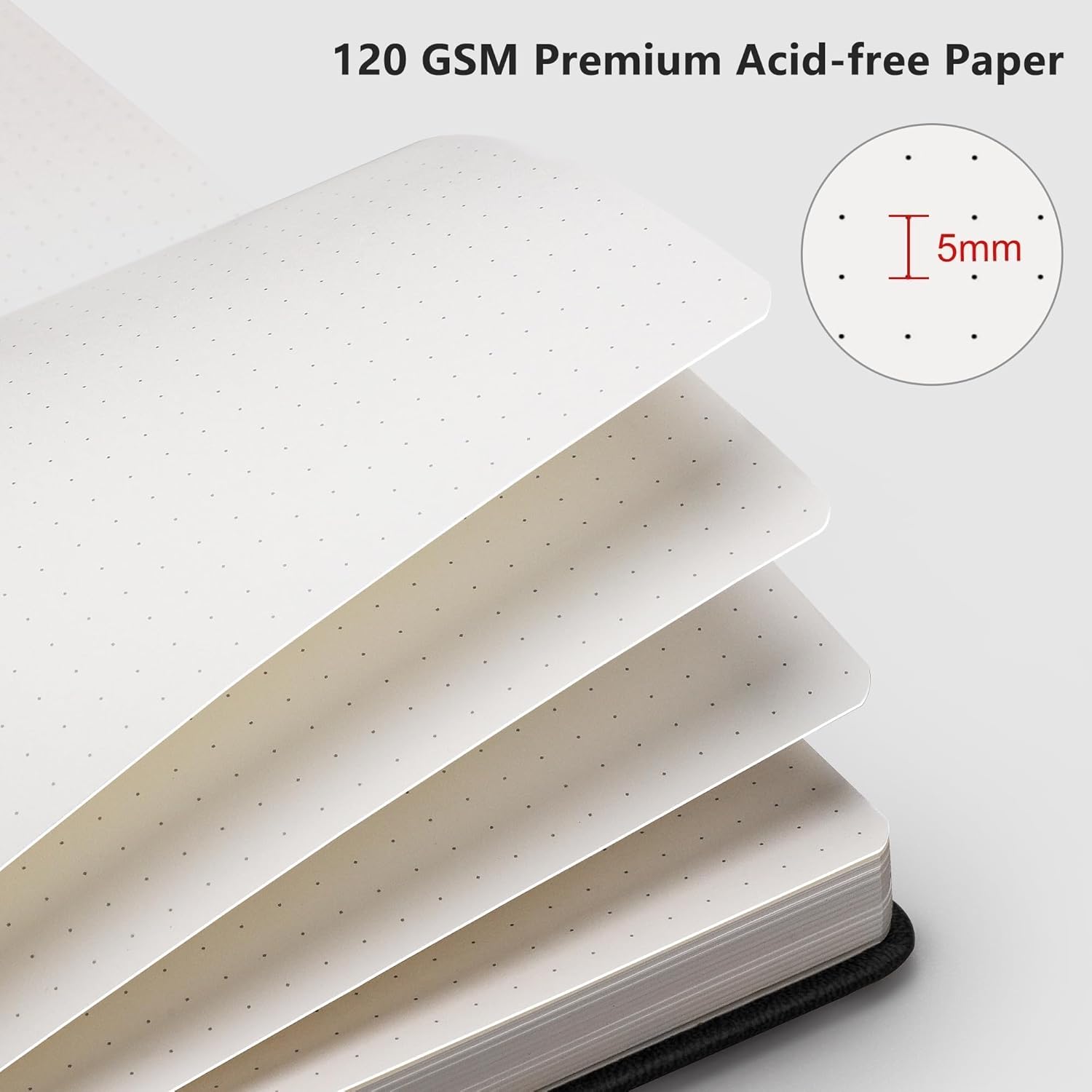 - BULLET DOTTED JOURNAL: RETTACY Bullet Dotted Journal comes in A5 size (5.7'' x 8.3''), 2-pack, 160 numbered pages per pack, durable and smooth Leather Hardcover, 120 GSM thick acid-free paper, pen holder, elastic closure band, 2 ribbon bookmarks, inner pocket & bullet journaling stencils