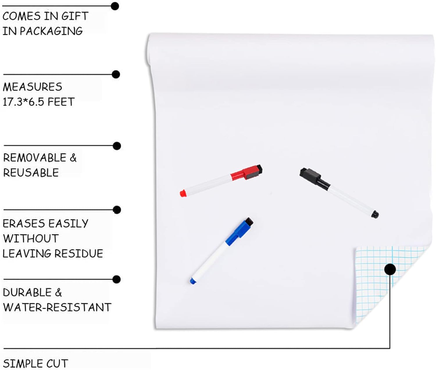 White Board Paper - 17.3” x 78.7” (6.5 Feet) - Self-Adhesive Dry Erase Board Sheet Sticker Removable Wall Decals for Kids, Office, School & Home with 3PCS Marker Pen