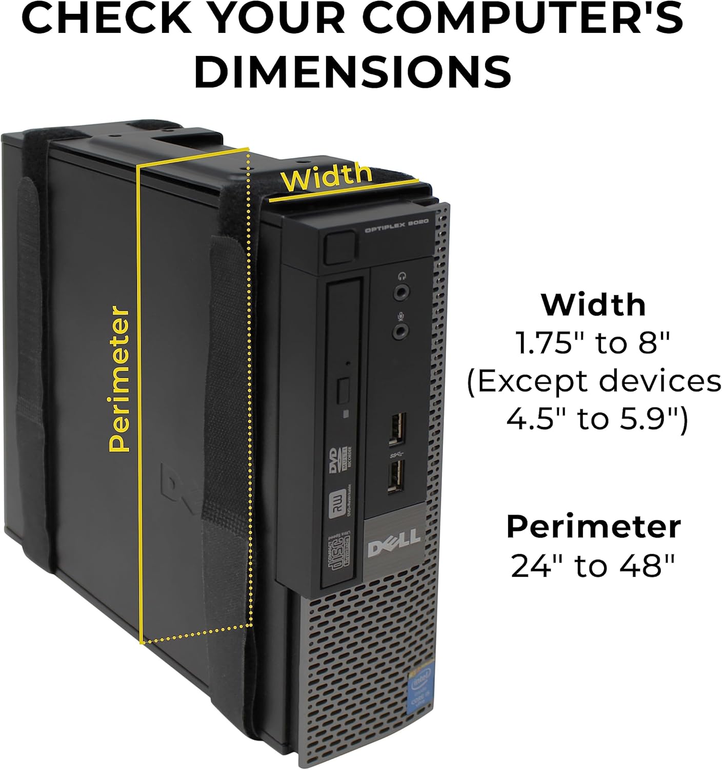 - Fits most small form factor PCs and devices: The HumanCentric adjustable under desk computer mount and wall PC mount bracket fits many SFF size devices including CPU, UPS, mini PC, GPU, eGPU cases. Fits devices with a width from 1.75” to 8” (except devices 4.5” to 5.9” wide) and a perimeter between 24” and 48”.