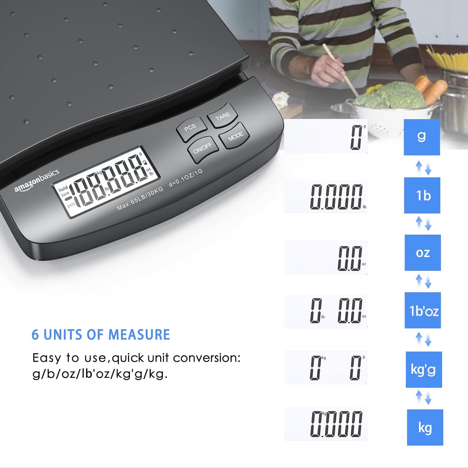 - 65 pound (30kg) capacity reads to 0.1 ounce (1g) in 0.1 ounce increments; minimum load weight is 0.2 ounces (5g)