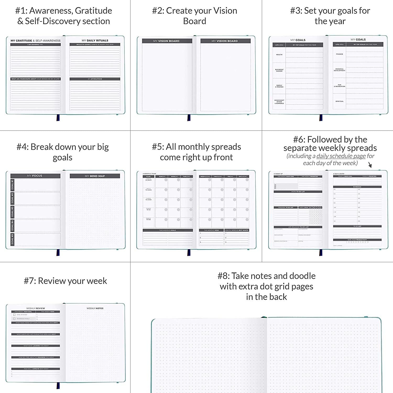 - DAILY, WEEKLY & MONTHLY PLANNING / REVIEW: Use detailed daily, weekly, and monthly planning pages to plan your agenda, set goals, and track habits. The planning notebook also has weekly reviews will regularly evaluate your progress.