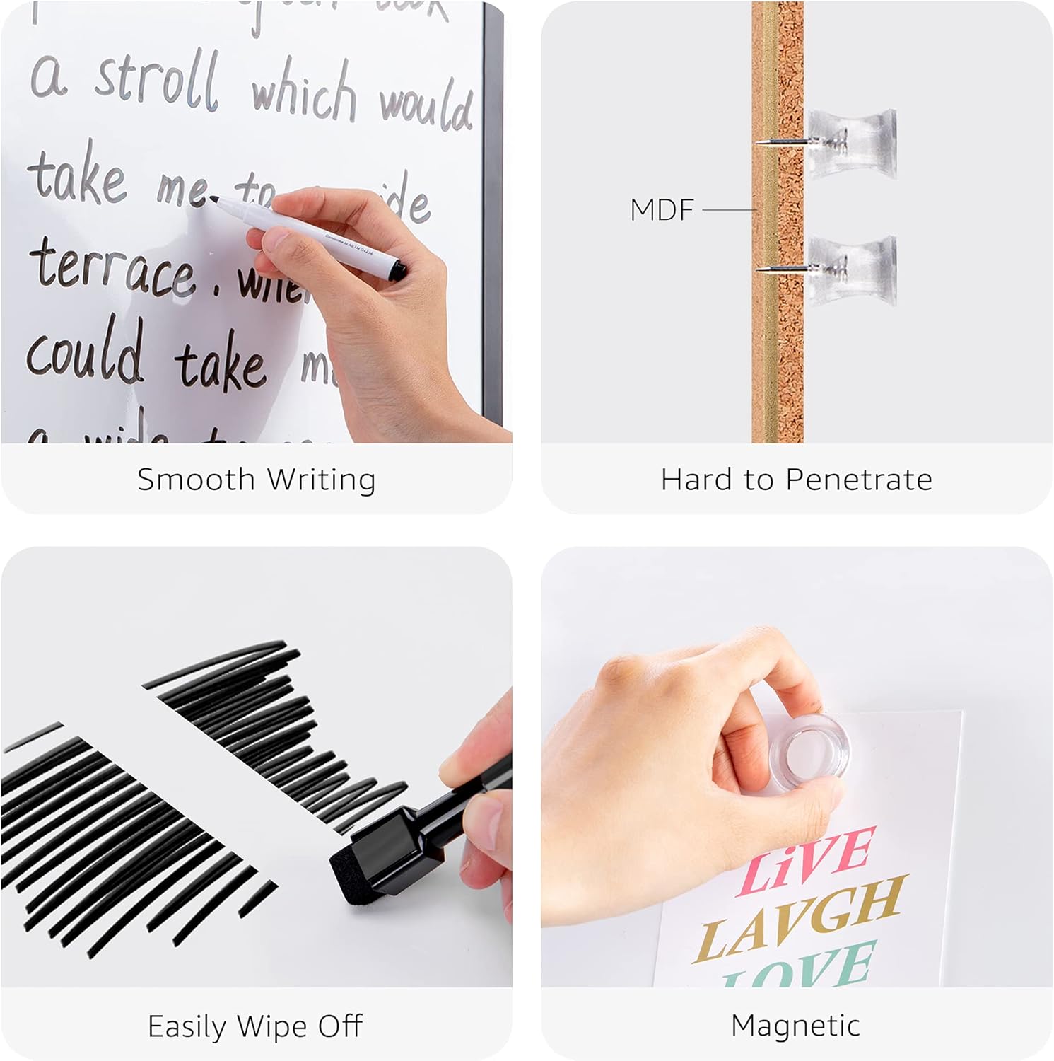 - Cork board side features a self-healing surface that doesn’t leave holes and can be used to pin pictures, notes, coupons, and more